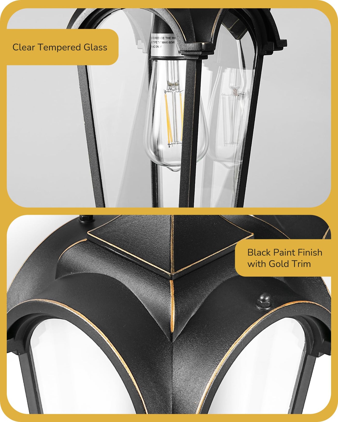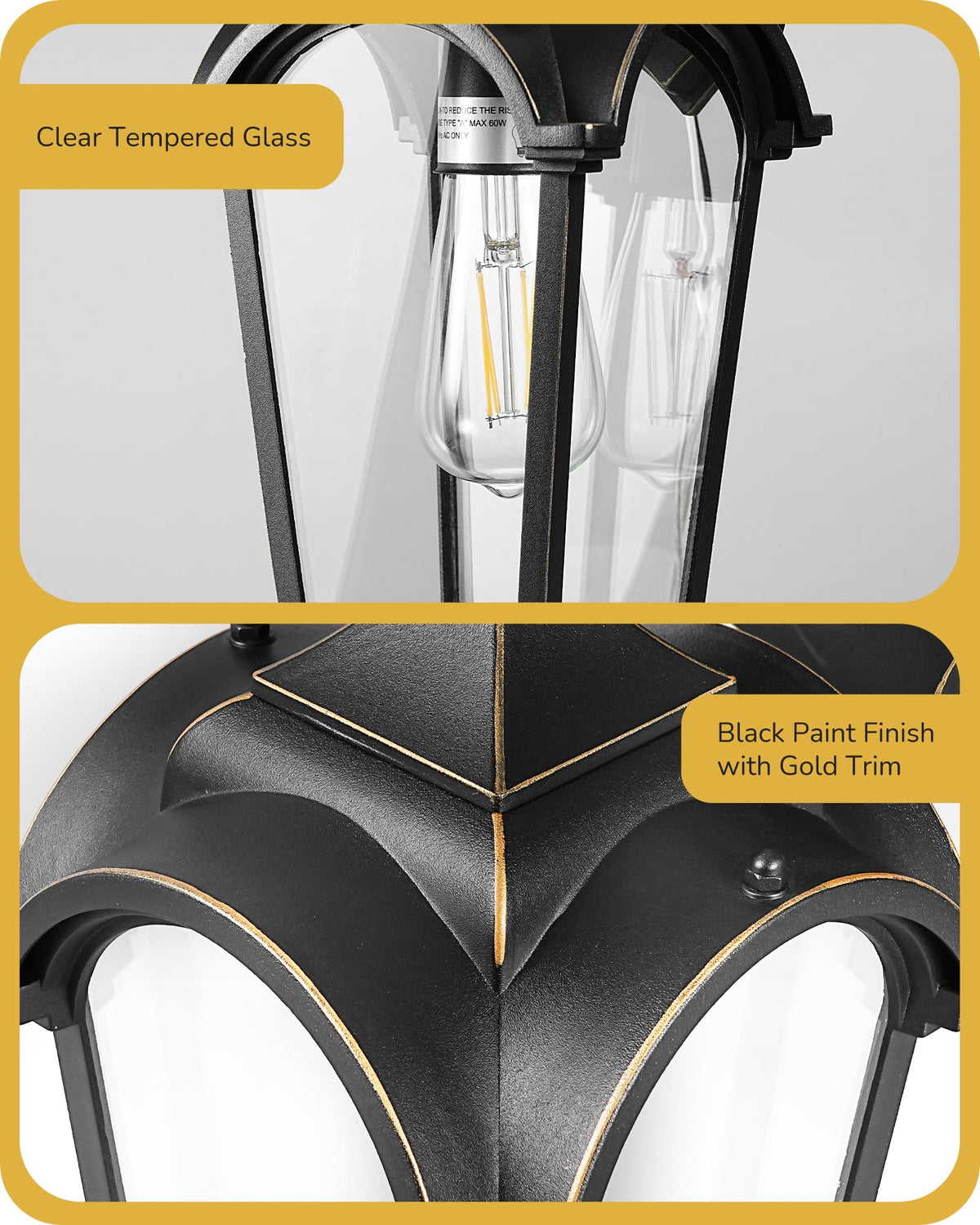 EDISHINE Dusk to Dawn Outdoor Wall Mount Light Fixture Elevate your outdoor space with our exquisite exterior wall light that seamlessly blends modern and retro styles. The matte black finish with gold trim exudes elegance and sophistication, while the high transparent and sturdy tempered glass shade allows for bright, clear light to illuminate your surroundings beautifully. Experience hassle-free lighting control with the automatic dusk to dawn feature. No more hassle with manual switches - the built-in photocell sensor ensures the light automatically turns off in daylight and on at night, providing convenience in your daily life. Our durable outdoor wall lantern is perfect for any weather conditions. Waterproof and rust-proof, its ideal for porches, front doors, decks, entryways, and garage sides. Illuminate your outdoor spaces with convenience and ease, built to meet all your outdoor lighting needs. Packing List: Wall light 1 Wire nuts 3 Outlet screw 2 Mounting bracket 1 Instruction manual 1 Specifications: - Input Voltage: 120VAC 60Hz - Max load Power for Bulb : Incandescent Bulb 60W (bulb not included) - Socket Type: Standard Medium E26 - Material: Aluminum + Glass - Product Size: (H)12.83 (W)6.1 (D)7.87inch - Function : Dusk to Dawn Sensor