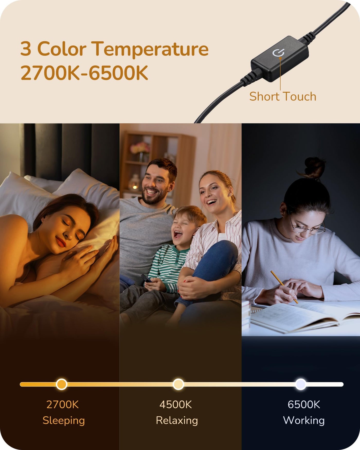 Q: What are the color temperature options available for the EDISHINE LED Table Lamp?A: The EDISHINE LED Table Lamp offers three color temperature options: 2700K (warm white), 4500K (neutral white), and 6500K (cool white), allowing you to customize the lighting according to your preference and the mood of the room.