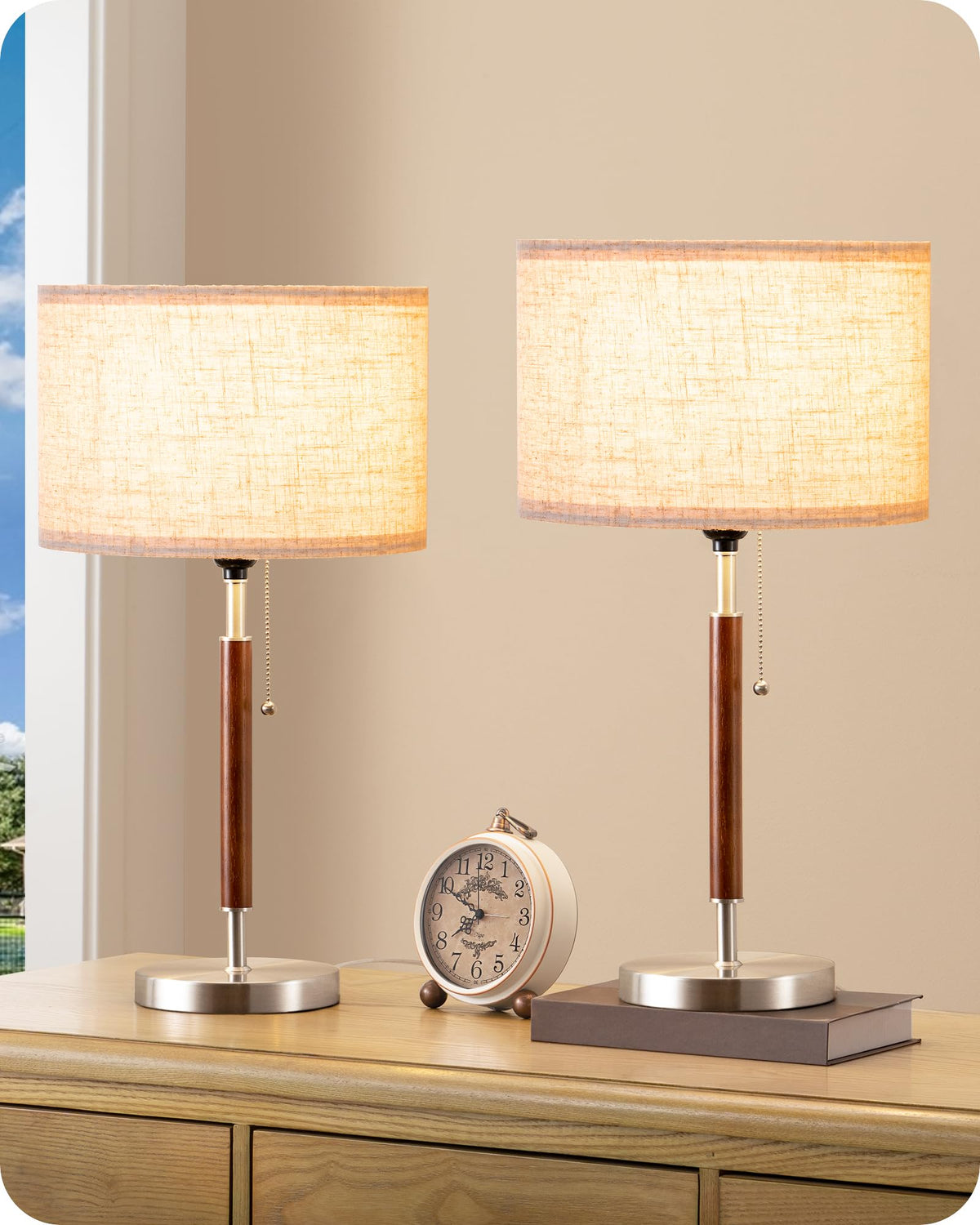 Edishine Mid Century Table Lamp Set Of 2, Pull Chain Switch Bedside Lamp, Linen Shade, Solid Wood Pole & Brushed Nickel Metal Ba