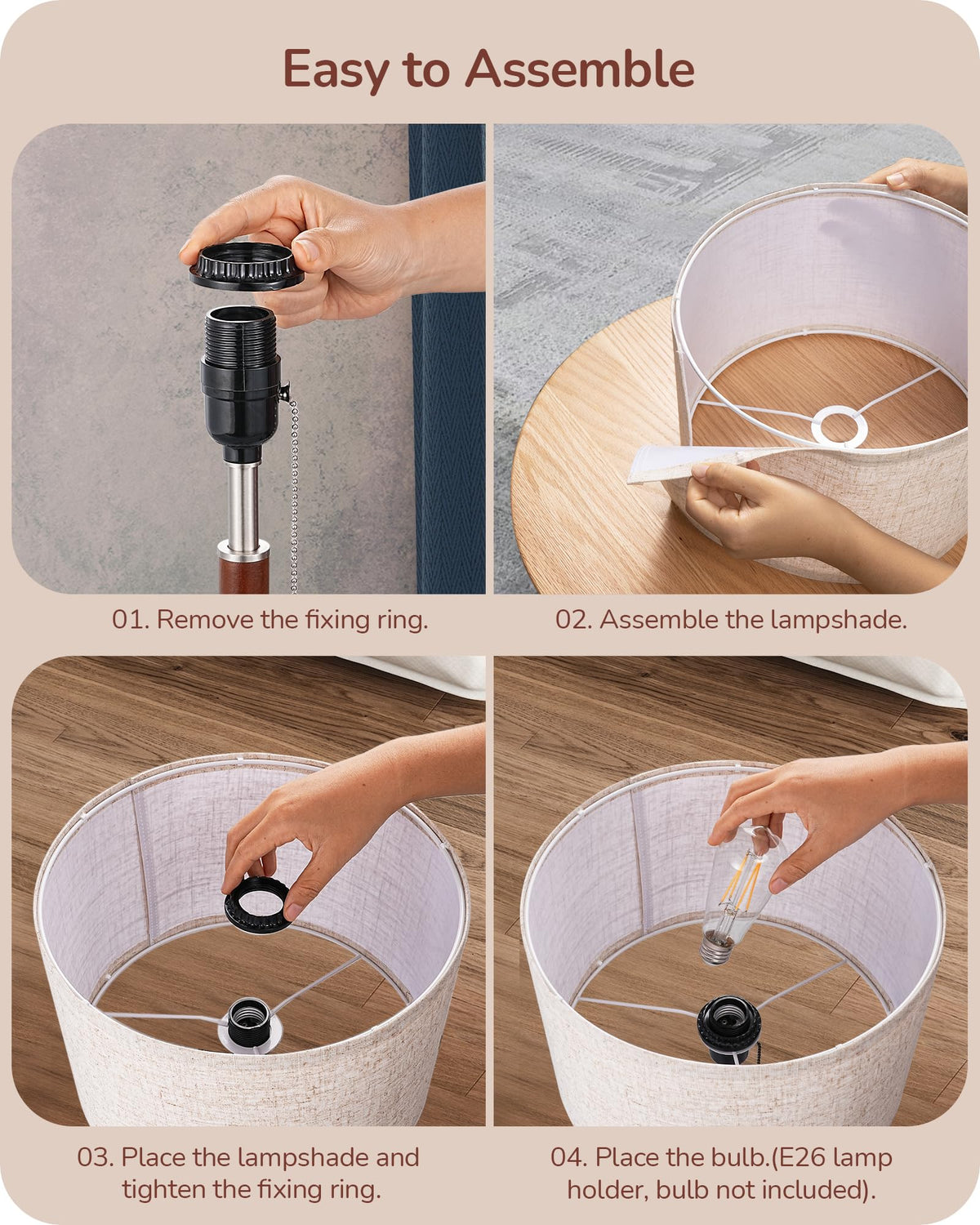 Q: What type of light bulb is compatible with the EDISHINE Mid Century Table Lamp?A: The EDISHINE Mid Century Table Lamp is equipped with an E26 socket, making it compatible with a variety of E26 base light bulbs. However, please note that the bulb is not included with the lamp.