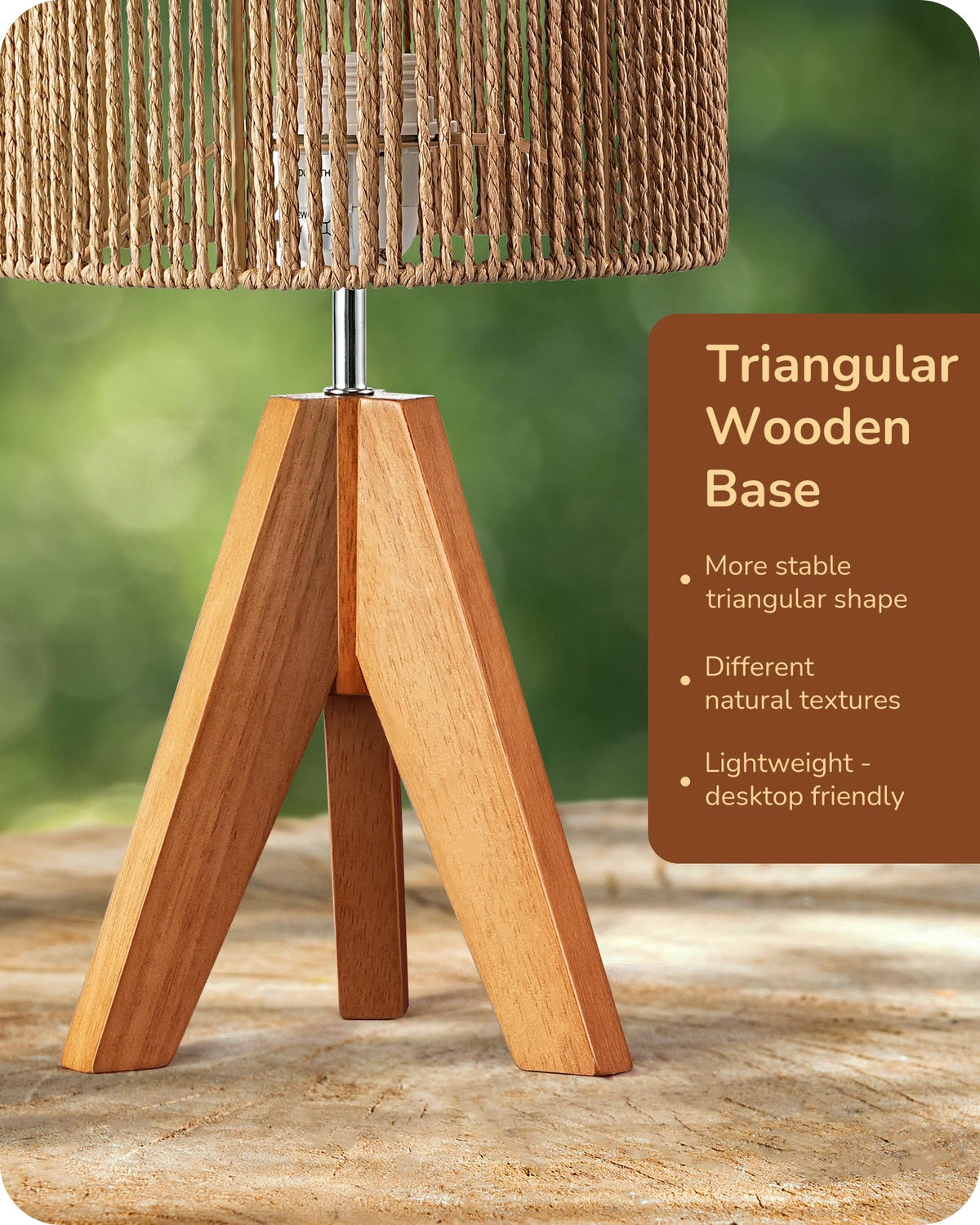 Q: How does the triangular base contribute to the lamp's stability?A: The lamp's triangular wooden base is designed to effectively reduce tipping or wobbling, ensuring stability. This lightweight base is easy to move and adjust without damaging your table surfaces.