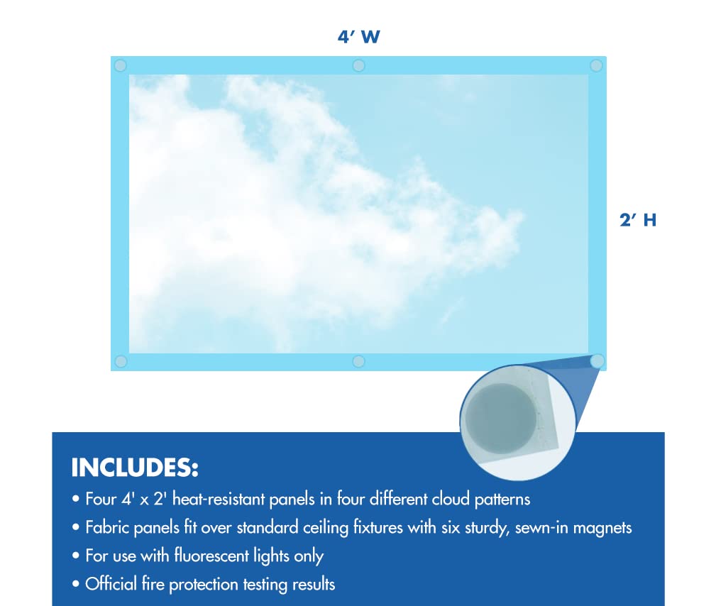 Q: What is the installation process for these light filters?A: Installation is simple and hassle-free; the Calming Clouds Light Filters feature six sturdy, sewn-in magnets that allow them to attach easily over standard ceiling light fixtures. Each pack includes four 2' x 4' panels, making it easy to cover multiple lights in your space.