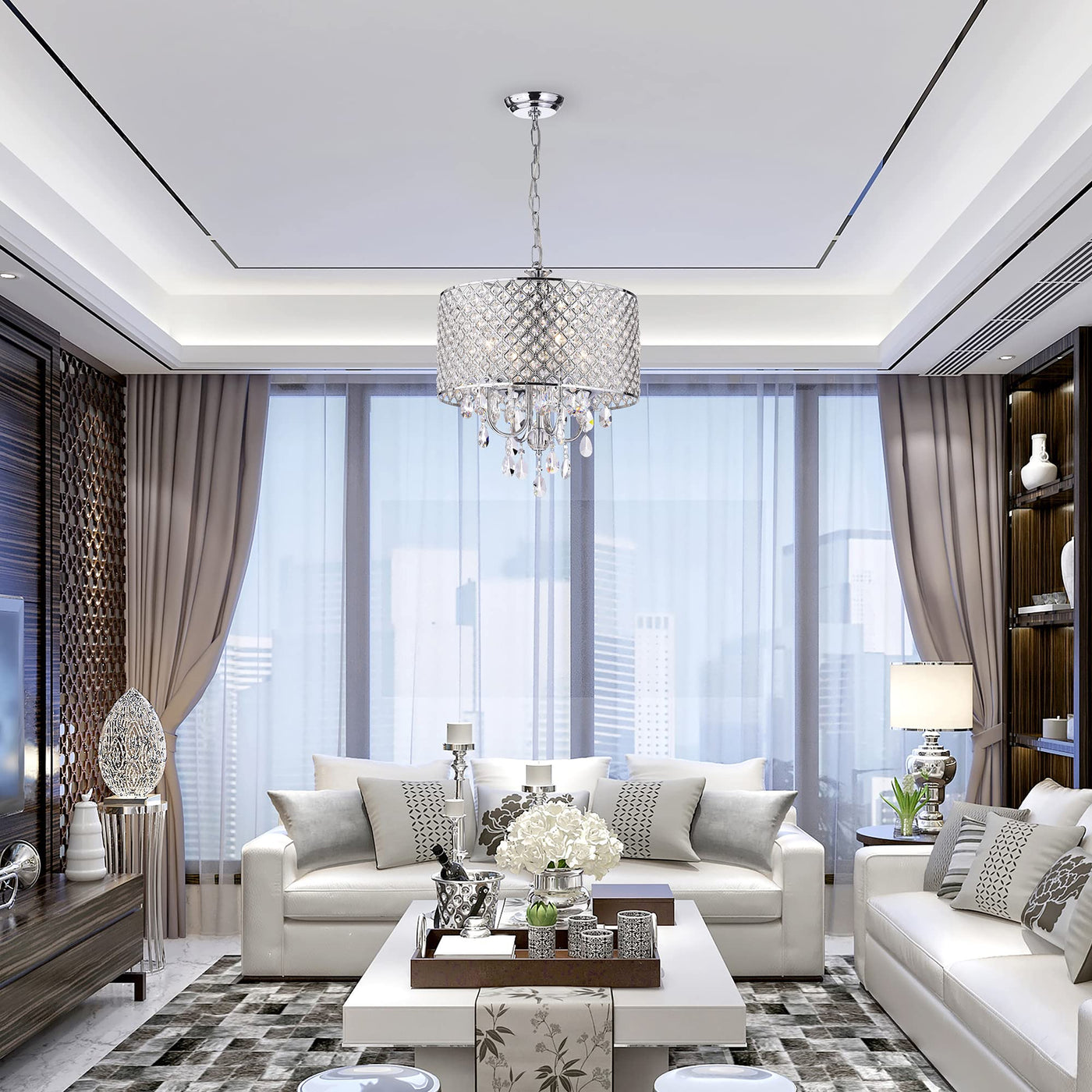 - **Glamorous Design:** The chandelier features an intricate crystal-encrusted drum shade complemented by three rows of high-quality cascading hanging glass crystals, all finished in a sleek chrome that adds a touch of modern sophistication.
