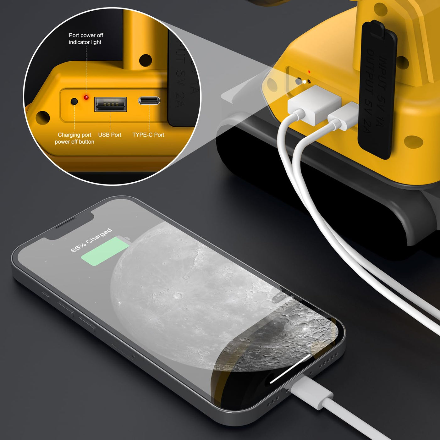 Product Name: Eefow Led Work Light For Dewalt 20V Max Rechargeable Battery, 64W 6400Lm, With Usb And Type C Charging Port,Suitable For Outdoor And Workplace Lighting Warm Tip: This Work Light Does Not Come With Batteries And Is Not Manufactured Or Sold By Dewalt. Battery Powered : Eefow 20V Max Led Work Light For Dewalt 18V/20V Lithium-Ion Batteries Dcb206 Dcb205 Dcb204 Dcb181 Dcb182 Dcb200 Dcb203 Dcb205-2 Dcb204-2 Dcb206-2 And More. Easy To Use Even When There Is No Power Supply Outdoors, As Long As You Bring Batteries. And You No Longer Need To Be Tethered To An Outlet Or Struggle With Tangled Cords, Making It Easy To Work In Tight Spaces, On Job Sites, Or Outdoors. Comprehensive Battery Protection Design: 1. Led Work Light Smart Chip: By Utilizing A Smart Chip To Monitor The Battery Voltage, It Ensures That The Led Work Light Automatically Ceases Operation When The Voltage Drops Below 15V. &Nbsp;2. Energy-Saving Mode: Upon Pressing The Usb Power-Off Button, The System May Enter An Energy-Saving Mode, Shutting Down Unnecessary Circuits To Reduce The Battery'S Self-Discharge Rate. Product Material: Abs Size: 6*3.5*7.8 Weight: 15.8Oz Lumens: High Brightness 6400 Lumens, Low Brightness 1700 Lumens Light Color: White Light 6000 K-6500 K, Yellow Light 2800-3200 K Lighting Gears: White Light Strong, White Light Weak, Yellow Light Strong, Yellow Light Weak Charging Port: Ubs, Type-C Dual Charging Port Product Details: Led Light*1 Instruction Manual*1
