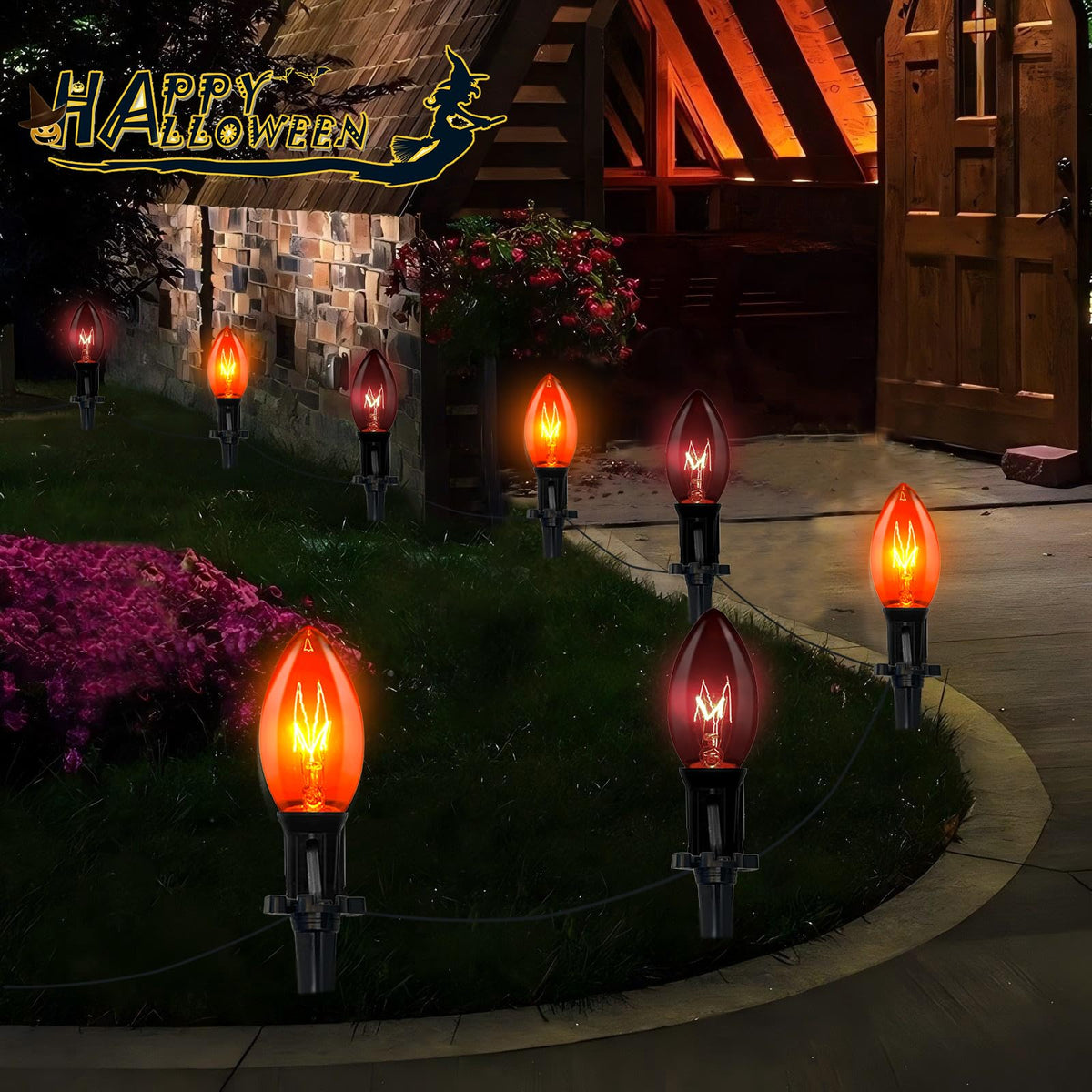 Q: What type of bulbs do the pathway lights use?A: The pathway lights feature 10 C9 incandescent bulbs with an E17 base, providing a spooky ambiance with their orange and black colors.