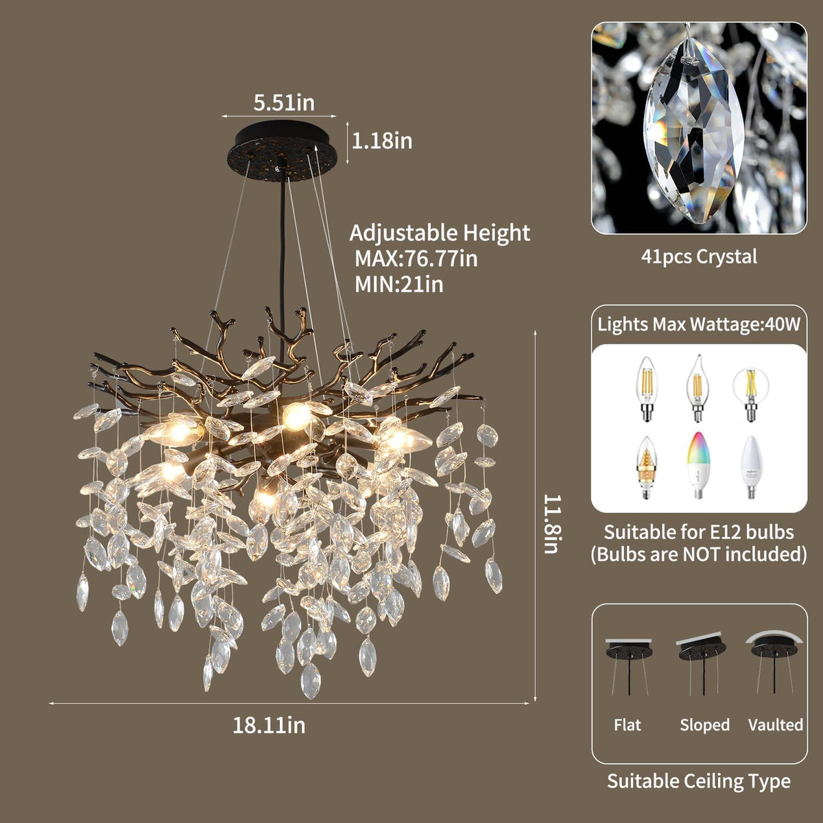 Specifications: Brand Name: Egm Product Name: Egm Black Tree Branch Crystal Chandelier, Modern Dining Room Crystal Chandelier 6-Light(E12), Hanging Round Chandeliers For Living Room Bedroom Foyer (18 In) Material: Metal&Crystal Crystal Tree Branch Chandelier Diameter: 18 Inches Adjustable Hanging Height: 21In To 77In Suitable For Ceilings: Flat, Sloped, Vaulted Number Of Bulbs: 18'' Crystal Tree Branch Chandelier Has 6 Bulbs (Bulb Not Included) Bulb Type: All E12 Base Bulbs, Including Edison, Incandescent, Halogen, Led, Cfl, Etc. Maximum Power 40W, Recommended Applicable Scenarios: Crystal Tree Branch Chandelier For Dining Room, Living Room, Foyer, Entryway, Hallway, Kitchen Island, Bedroom, Bathroom, Library, Over Table, Etc. Light Fixture Style: Modern, Romantic Etc. Product Including: 1 *Chandelier Light Fixture 3 *Adjustable Cable 6 * Light Branches 1 * Wire Cap 1 * Chandelier Cap 1 * Installation Package