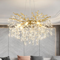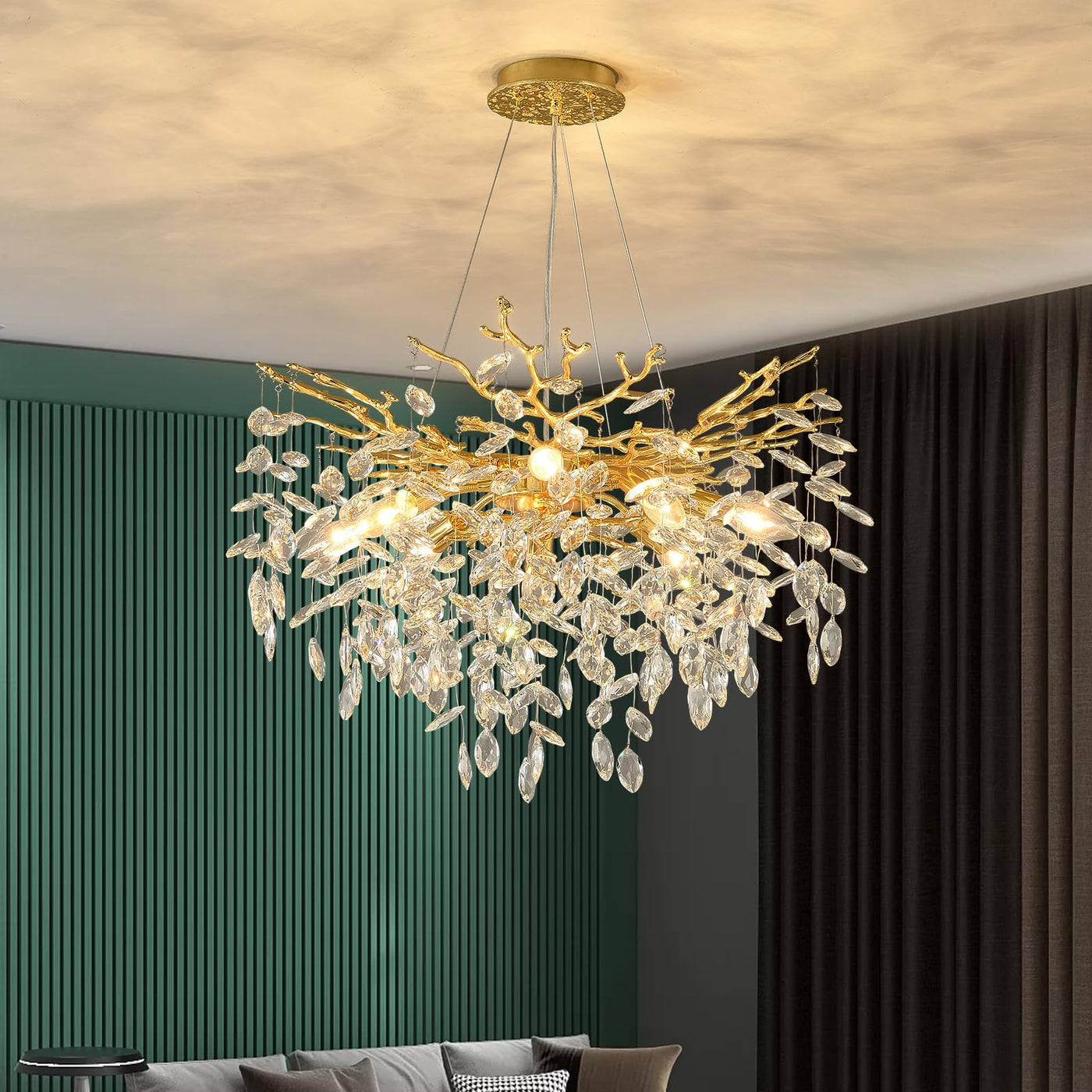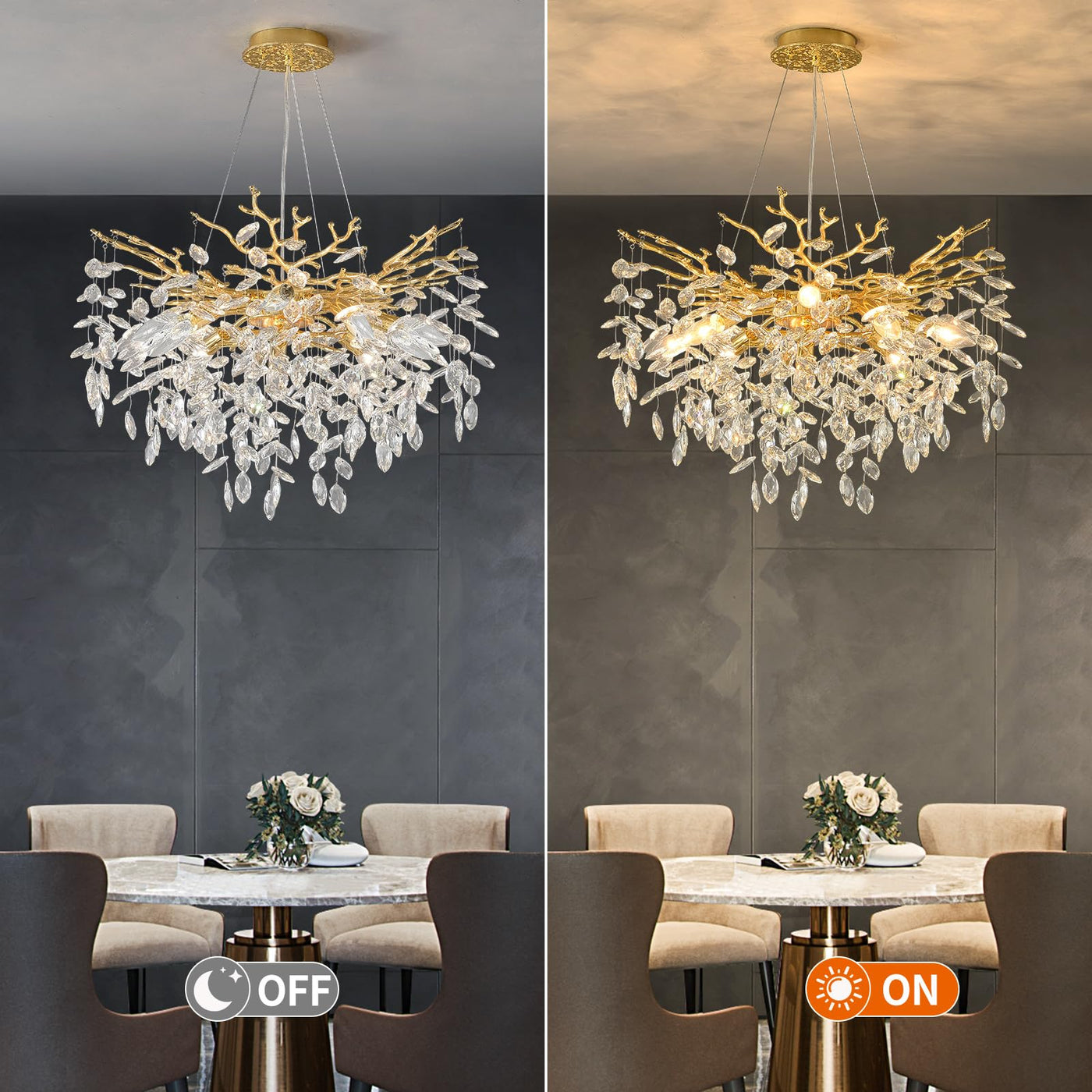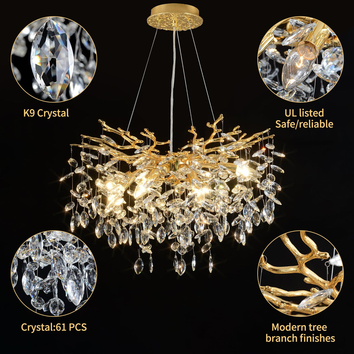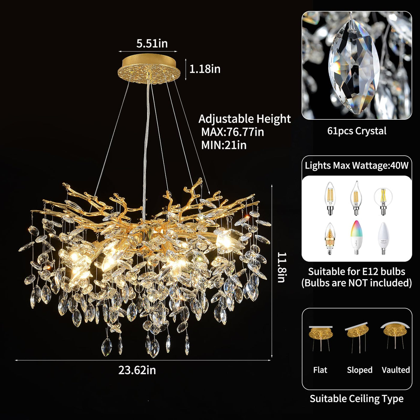 Specifications: Brand Name: EGM Product Name: EGM Gold Crystal Chandelier, 24-Inch Modern Raindrop Light Fixtures 8-Light, Hanging Round Gold Dining Room Crystal Chandelier, Tree Branch Chandeliers for Bedroom Foyer E12 Material: Metal&Crystal Crystal Tree Branch Chandelier Diameter: 24 inches Adjustable Hanging Height: 21in to 77in Suitable for Ceilings: Flat, sloped, vaulted Number of Bulbs: 24'' crystal tree branch chandelier has 8 bulbs (BULB NOT INCLUDED) Bulb Type: All E12 base bulbs, including Edison, incandescent, halogen, LED, CFL, etc. Maximum power 40W, recommended Applicable Scenarios: crystal tree branch chandelier for dining room, living room, foyer, entryway, hallway, kitchen island, bedroom, bathroom, library, over table, etc. Light Fixture Style: modern, romantic etc. Product Including: 1 *Chandelier light fixture 3 *Adjustable cable 6 * Light branches 1 * Wire cap 1 * Chandelier cap 1 * Installation package