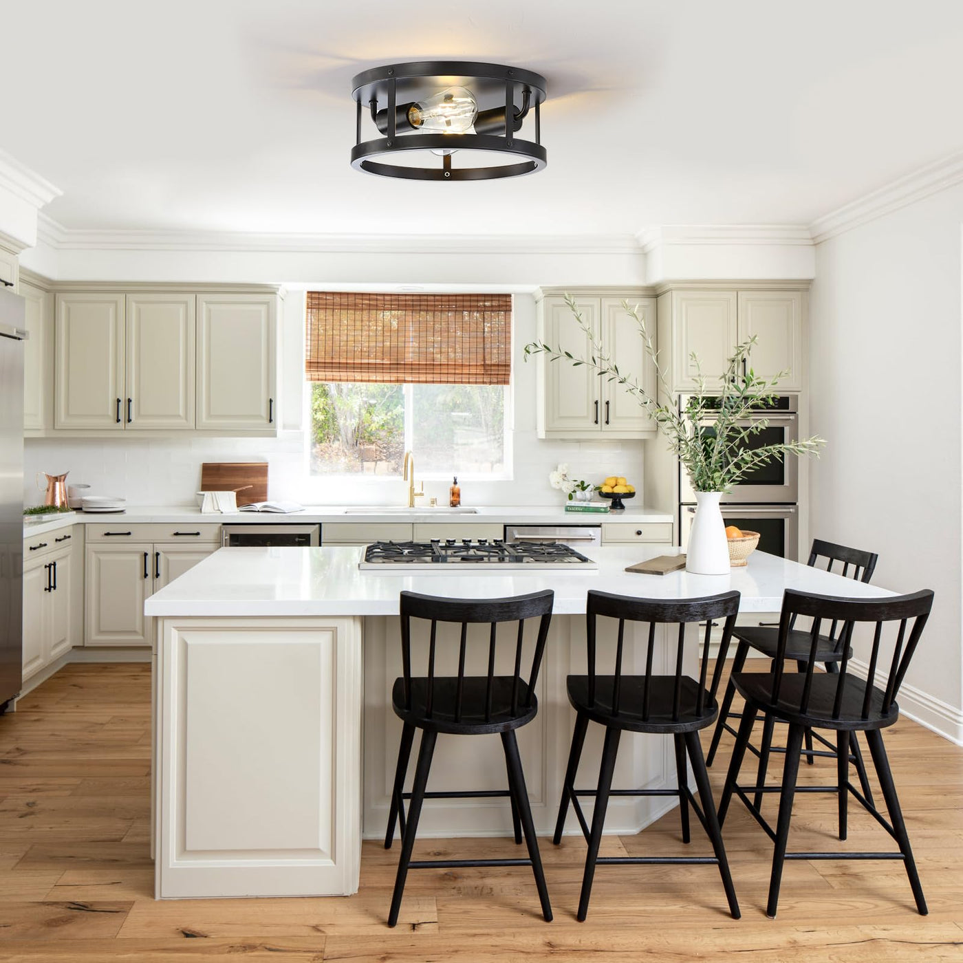 The Eietonte Flush Mount Ceiling Light Fixture is a stylish and functional lighting solution designed to enhance the ambiance of various spaces in your home or commercial settings. With its modern farmhouse aesthetic, this black 2-light fixture is perfect for illuminating hallways, kitchens, bedrooms, and more.