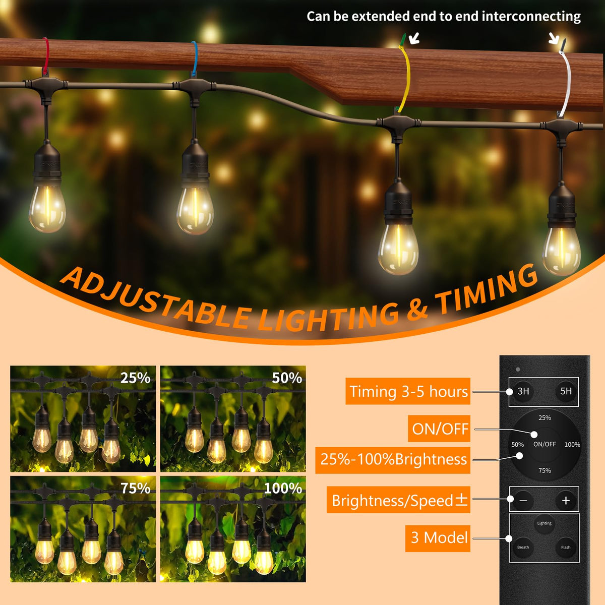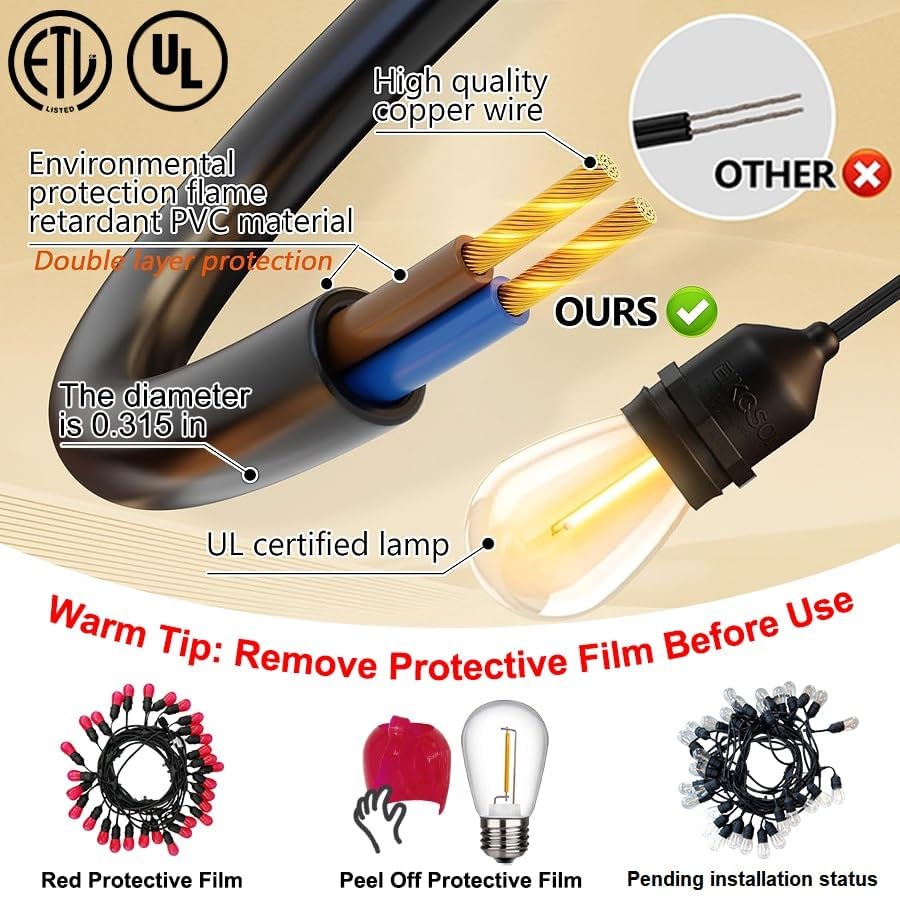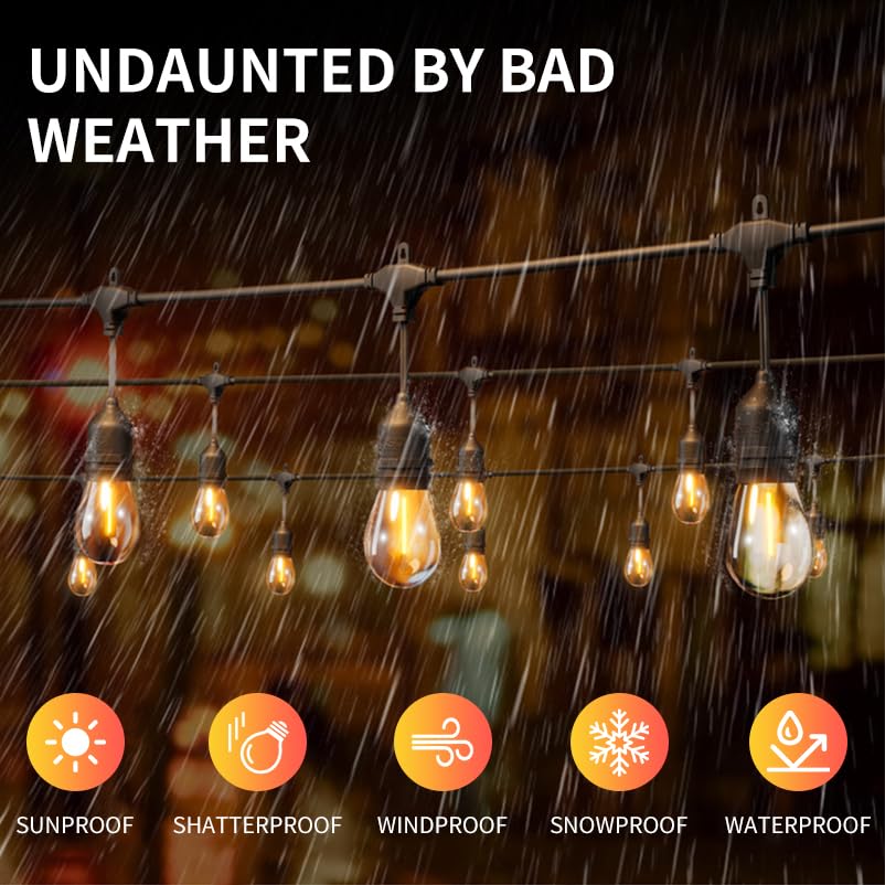 string lights for outside Our Edison Bulb String Lights Outdoor Set has undergone rigorous quality inspection and hundreds of hours of development with leading gardening experts. These outdoor string lights for patios are crafted to the highest standards.These LED String Lights are made from durable materials with heavy-duty plastic bulbs and the design is super sturdy to withstand year-round use.Customers love how easy it is to install EIKOSON garden string lights. Each set of outdoor deck lights includes 100 zip ties, which means you can hang the LED outdoor string lights directly from the box with no additional tools required. Furthermore, our outdoor string lights for porch lights come with a practical remote control that allows you to adjust them to fixed, pulsing or flashing modes.EIKOSON Outdoor LED String Lights Each LED bulb emits a warm color temperature of 2200K that is very easy on the eyes. Create a charming atmosphere with these garden or balcony lights, like bathing in luxurious light,beautiful brass, or in a starry fortress like Bethlehem. Then, when you're ready for an intimate dinner, create a romantic atmosphere with these bistro lights.easily transform your backyard into an inviting outdoor oasis. They will bring a warm, inviting glow to your patio, porch or garden area, perfect for entertaining a group of friends.