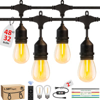 Q: How long is the EIKOSON string light set and how many bulbs does it have?A: The EIKOSON string light set is 50 feet long and includes 32 high-quality bulbs, with a spacing of 1.58 feet between each bulb.