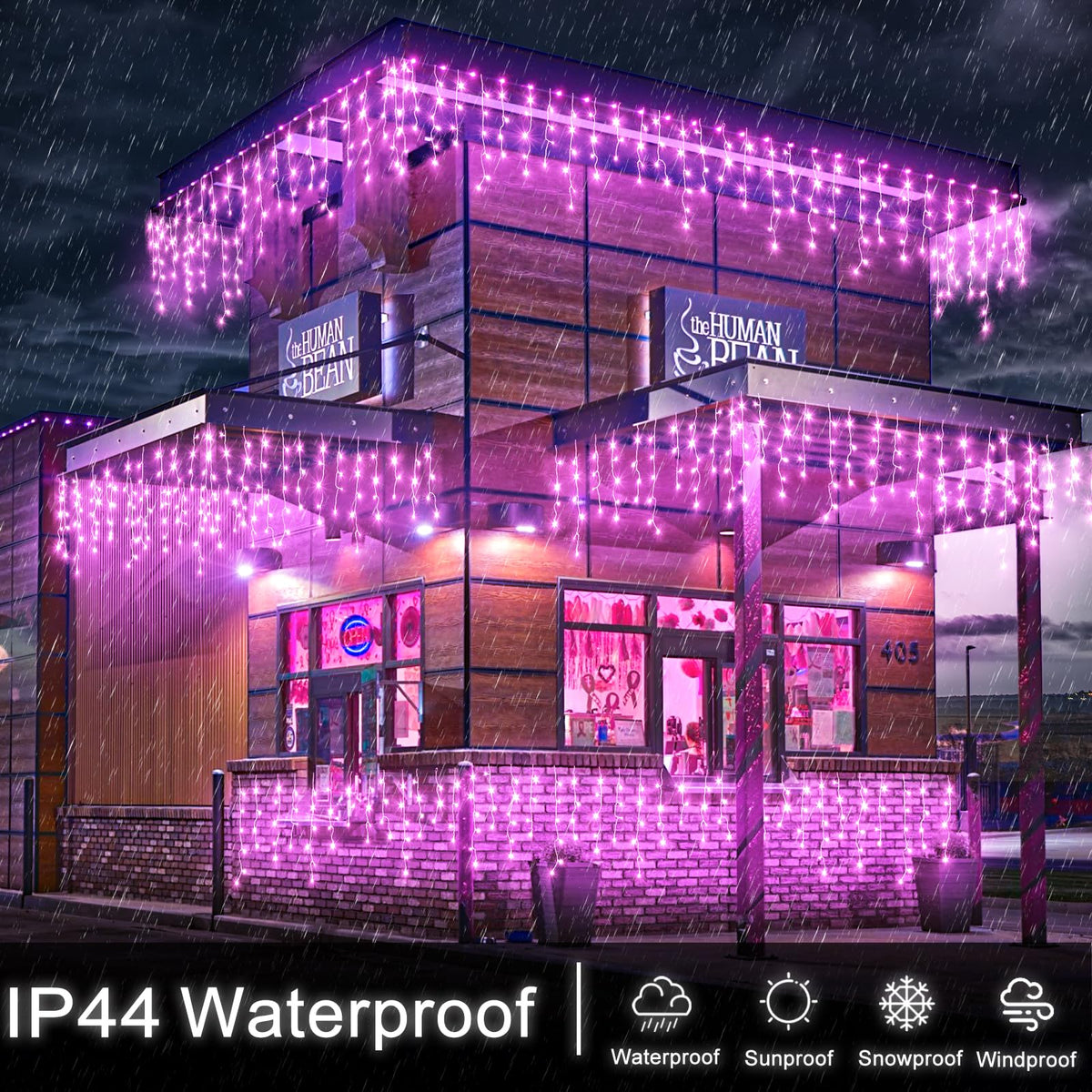 Einiiya Christmas Lights Outdoor 66ft 640 LED Waterproof Pink Icicle Lights, 8 Modes, Model BG-CL3M3-306L01