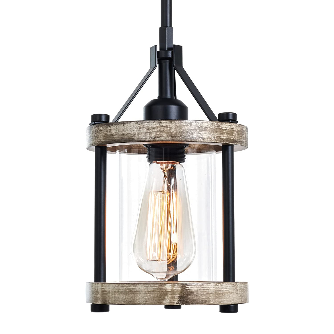 Wood & Metal Pendant Light: This Pendant Light has a farmhouse style cage design, with clear glass shade in black and wood finish. A combination of vintage and modern styles. Perfect for islands and kitchen sinks, dining room or entryways. | Adjustable Length: Adjustable length from 3.7 inch to 43 inch with 4 supplied pipes, this pendant light can meet all your needs by customizing hanging height; the canopy could be adjusted from 0-90°, applied to either flat or sloped ceiling. | Easy to Install: This farmhouse glass hanging pendant light come with all the mounting hardware for quick installation, Open bottom design makes it much easier for bulb replacement. UL standard for safety and quality. TIP: The glass of the chandeliers may be broken during transportation. We will provide a free exchange if you find any damage. | Wide Application: The industrial pendant light fixture is a combination of wood & metal. Adds elegant and farmhouse appearance to your hallway, kitchen, bedroom, dining Hall and entryway, brighten up any living space. | Bulb Type & Dimmable: This modern wood pendant lights kitchen island requires 1 x E26 base bulb Max 60W (Bulb is not included). Compatible with Incandescent bulb/LED Bulb/CFL Bulb /Halogen bulb. And it also compatible with dimmer (dimmer is not included ).