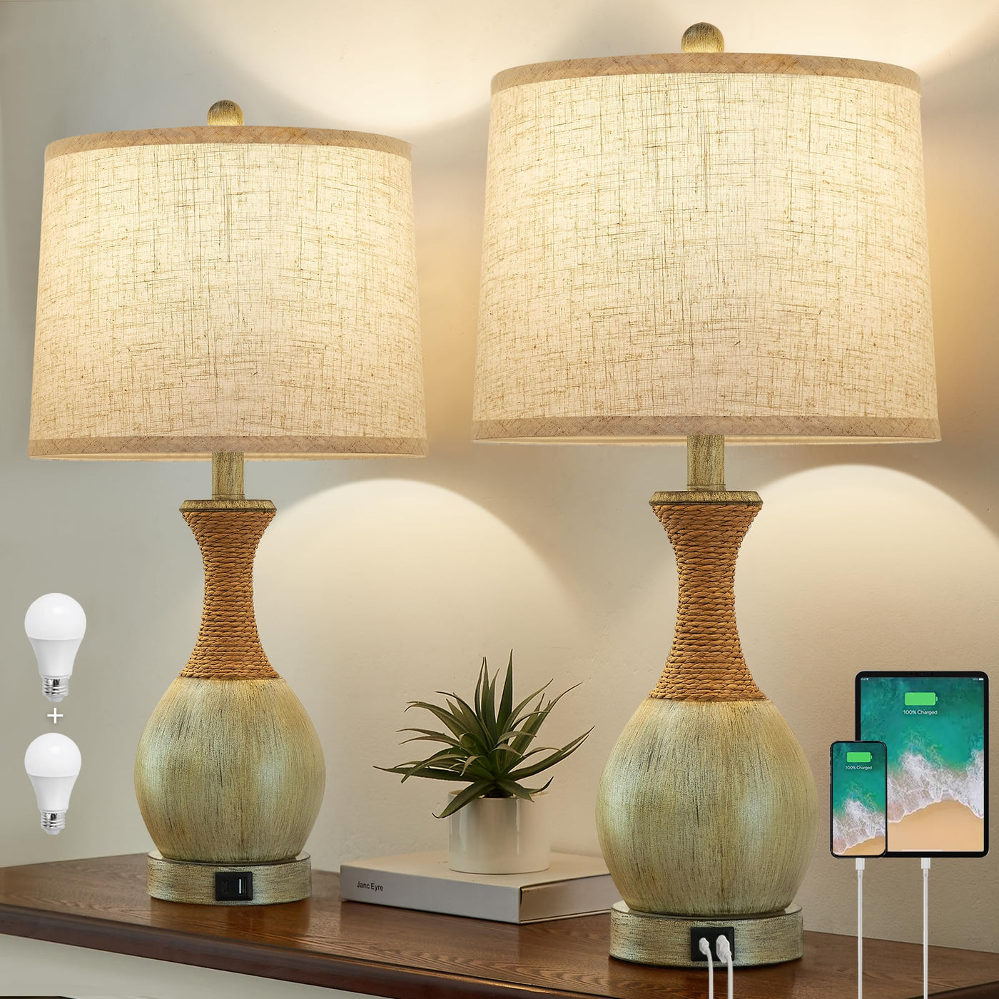 Ejiaxin Bedside Table Lamp Set Of 2 - Bedroom Table Lamps With 3 Color Temperatures - Boho Rattan Lamps With Usb A+C Charging Po