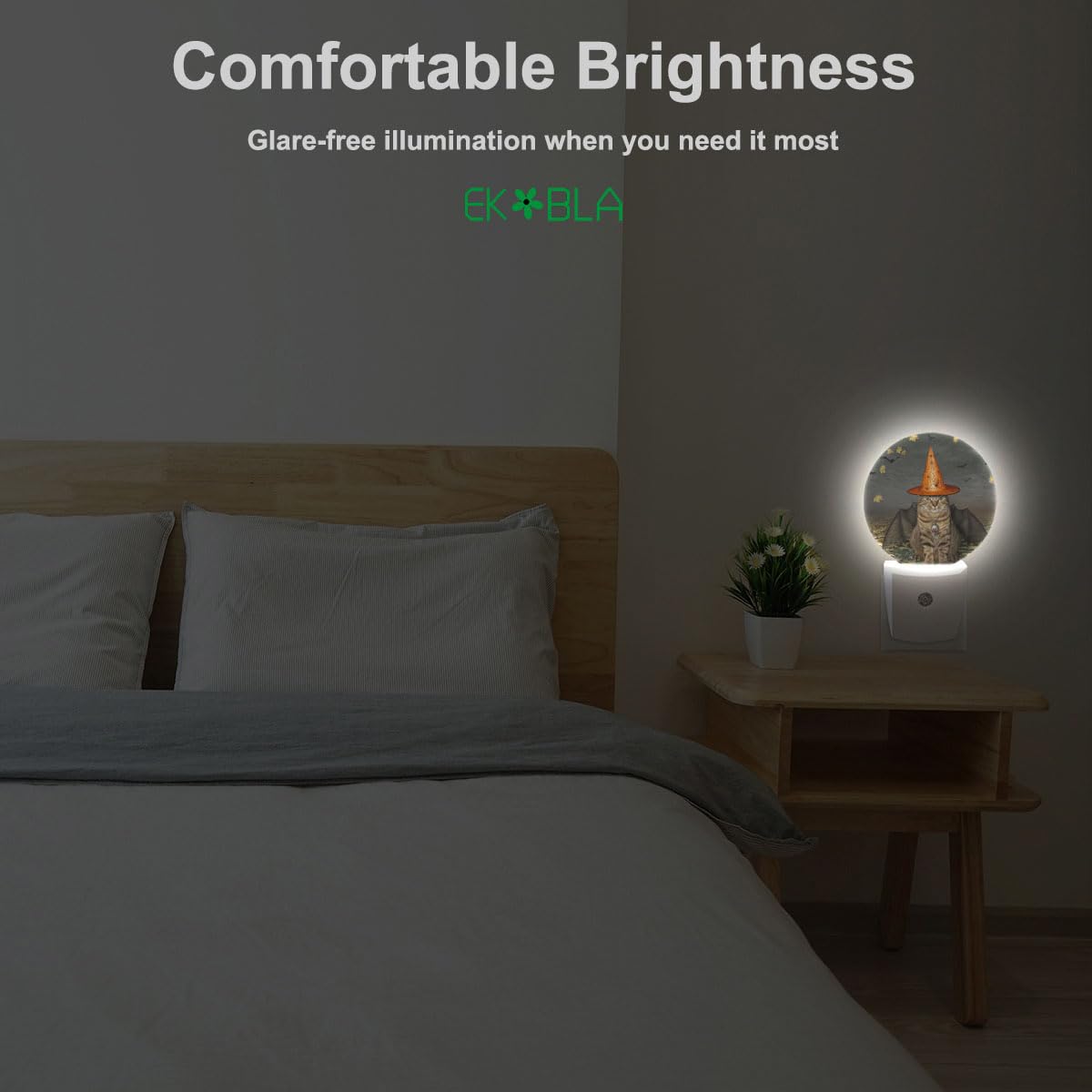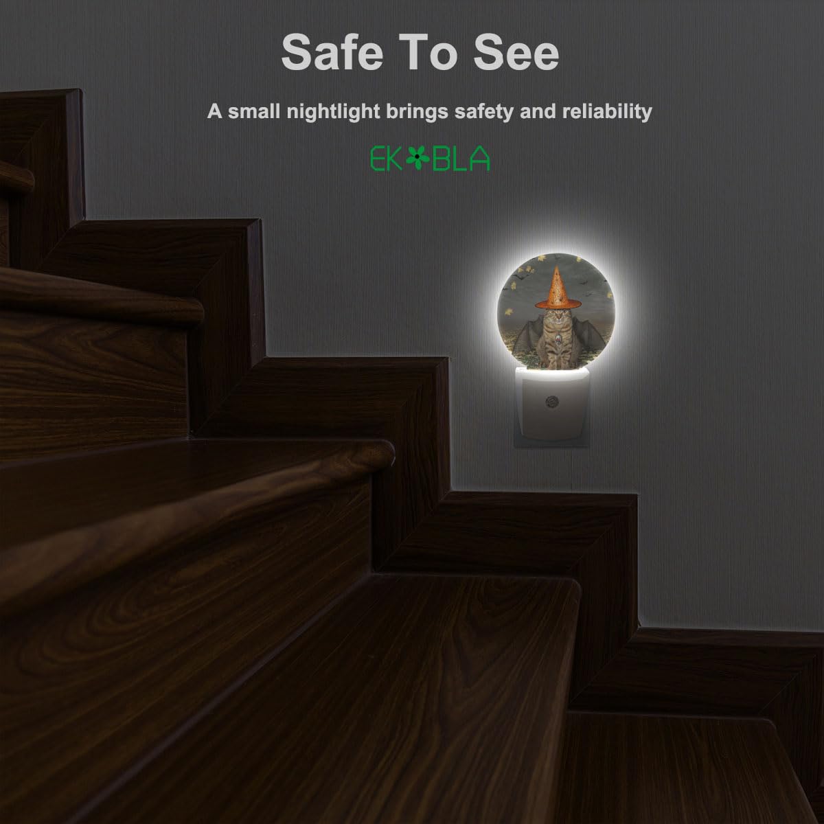 Q: How does the EKOBLA Halloween Bats Cat LED Night Light work?A: The EKOBLA night light features a sensitive dusk to dawn sensor that automatically turns the light on at night and off during the day. Simply plug it into a wall socket, and it will illuminate your space with a gentle glow when it detects low ambient light.