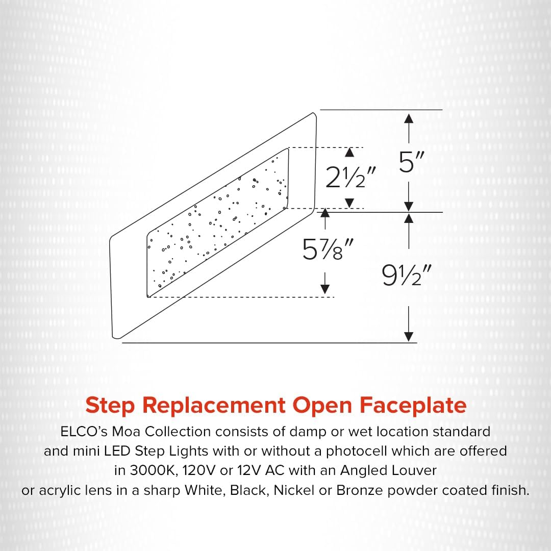 This Elst11W Replacement Open Faceplate Is For Elst11W Led Step Light Is A Component Designed To Replace Or Cover The Existing Open Faceplate Or Cover Of An Led Step Light Fixture. It Is Used For Step Lights To Allow The Light To Shine In A Specific Direction. From The Manufacturer: Elcos Moa Collection Consists Of Damp Or Wet Location Standard And Mini Led Step Lights With Or Without A Photocell Which Are Offered In 3000K, 120V Or 12V Ac With An Angled Louver Or Acrylic Lens In A Sharp White, Black, Nickel Or Bronze Powder Coated Finish.