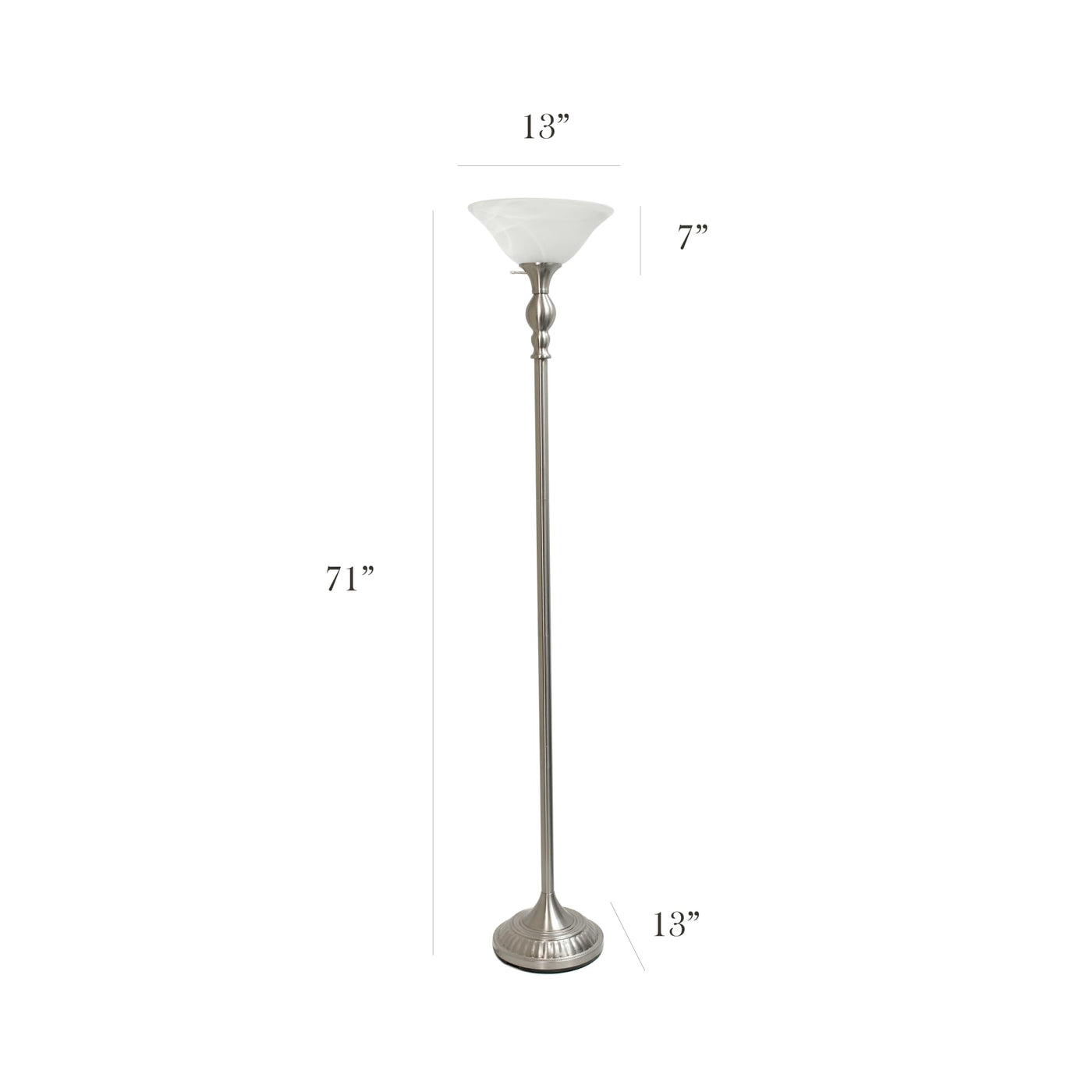 Brushed Nickel Finish | White Glass Shade | Uses 1 x 100 watt equivalent 3 way Type A Medium Base Bulb (not included) | Dimensions; L: 13" x W: 13" x H: 71" | Some Assembly Required | Rotary switch located on lamp holder