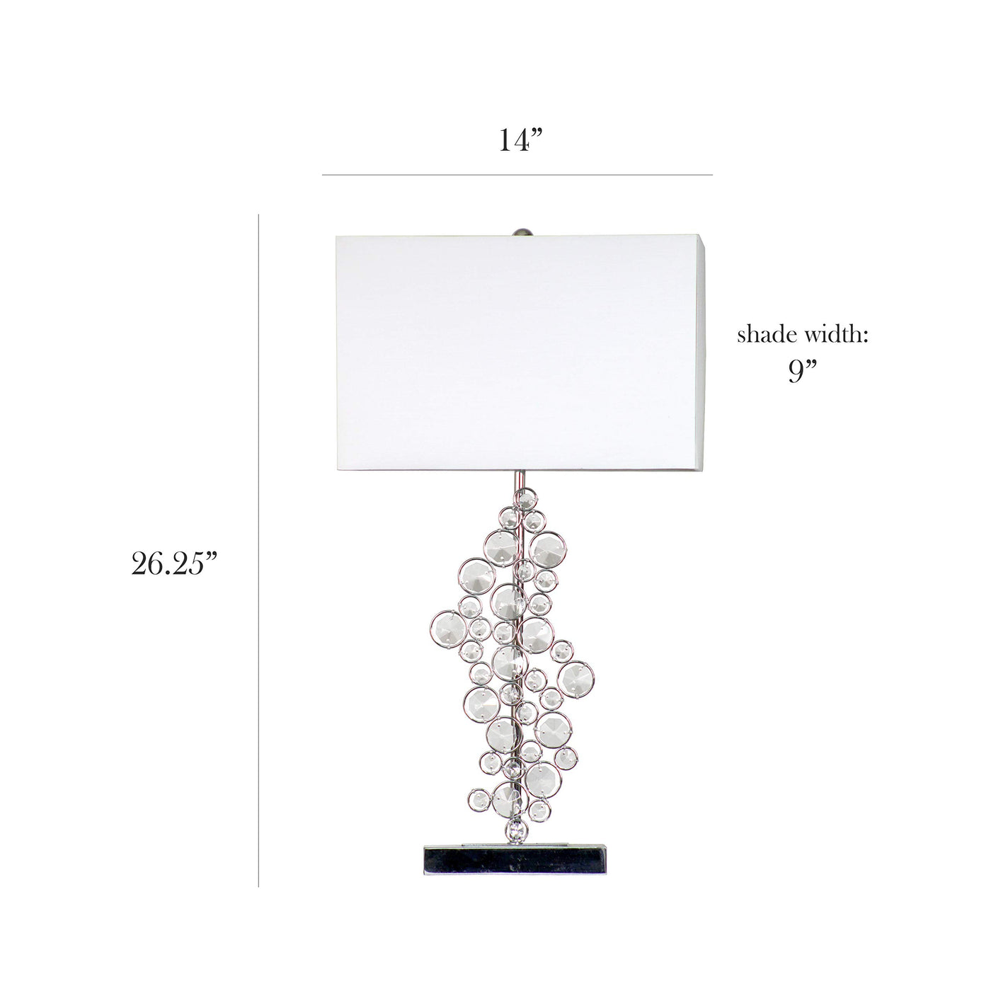 Q: What are the dimensions of the Elegant Designs LT1027-CHR Table Lamp?A: The dimensions of the lamp are 14 inches in length, 9 inches in width, and a total height of 26.25 inches.