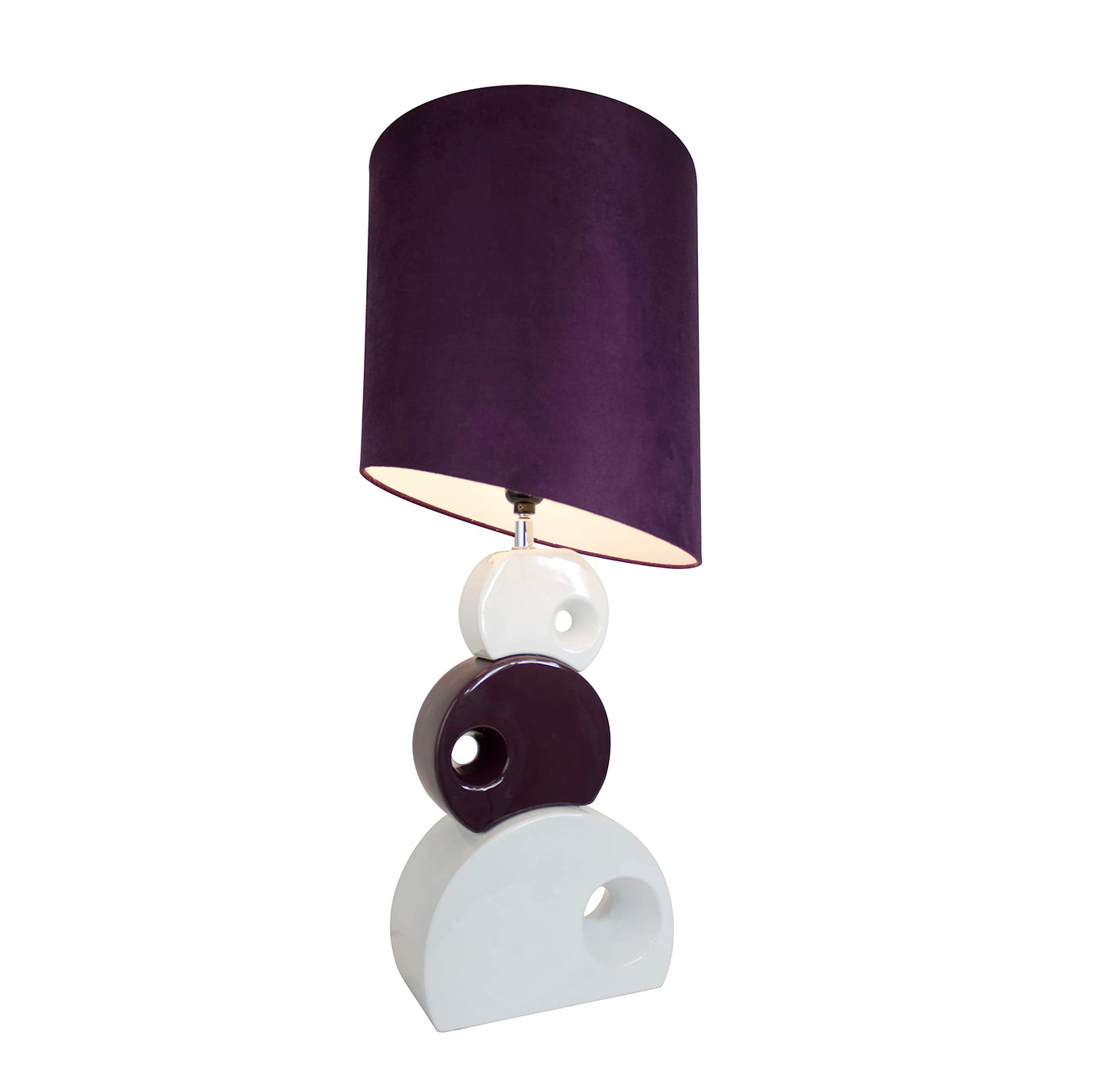Asymmetrical purple fabric shade | Painted white and shades of purple stacked ceramic circles | Fresh style perfect for kids room or college dorm | Height: 28.5" Shade diameter: 12" | Uses 1 x 60W equivalent Type A medium base bulb (not included)