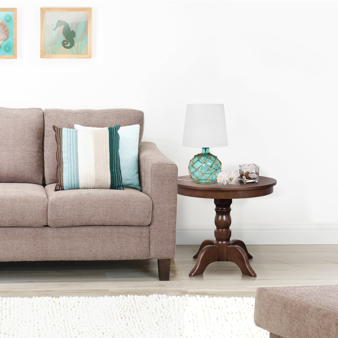 Q: What makes the design of this lamp suitable for coastal decor?A: The lamp features an aqua glass base wrapped in natural rope, which complements nautical themes and adds a beachy feel, making it perfect for coastal decor.