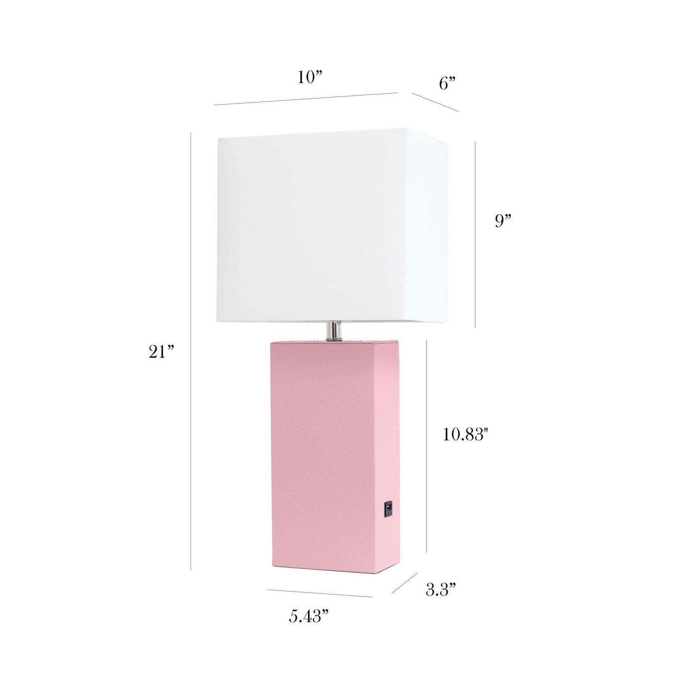 MODERN DESIGN: A crisp, white rectangular shade sits atop a beautiful leather wrapped base with a built in USB port, making it a perfect fit for your living room, bedroom, office, or foyer! | USB PORT FEATURE: Conveniently located on the base of the lamp, you can find 1 x USB charging port accessible to charge your electronics nearby. | BULB REQUIREMENT SOLD SEPARATELY: This table lamp uses 1 x 60 watt equivalent type A E26 medium base bulb, which is not included in your purchase. | ASSEMBLY & USE: Product ships assembled and will only require you to secure the lamp shade to the base. | PRODUCT SIZE: Overall product size is L: 10" x W: 6" x H: 21" and weighs 3.28 lbs.