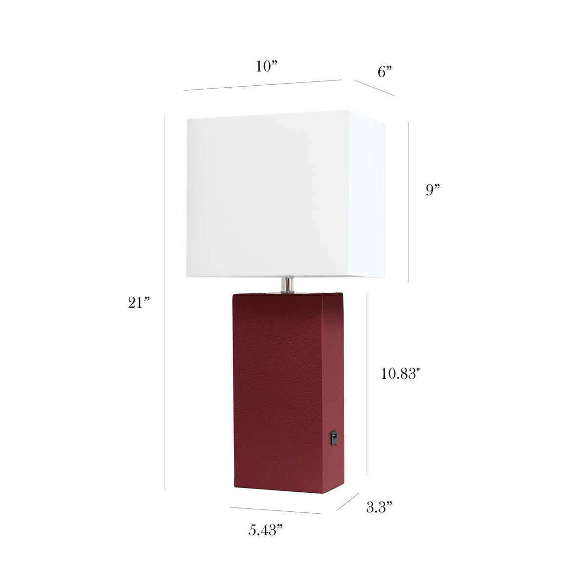 MODERN DESIGN: A crisp, white rectangular shade sits atop a beautiful leather wrapped base with a built in USB port, making it a perfect fit for your living room, bedroom, office, or foyer! | USB PORT FEATURE: Conveniently located on the base of the lamp, you can find 1 x USB charging port accessible to charge your electronics nearby. | BULB REQUIREMENT SOLD SEPARATELY: This table lamp uses 1 x 60 watt equivalent type A E26 medium base bulb, which is not included in your purchase. | ASSEMBLY & USE: Product ships assembled and will only require you to secure the lamp shade to the base. | PRODUCT SIZE: Overall product size is L: 10" x W: 6" x H: 21" and weighs 3.28 lbs.