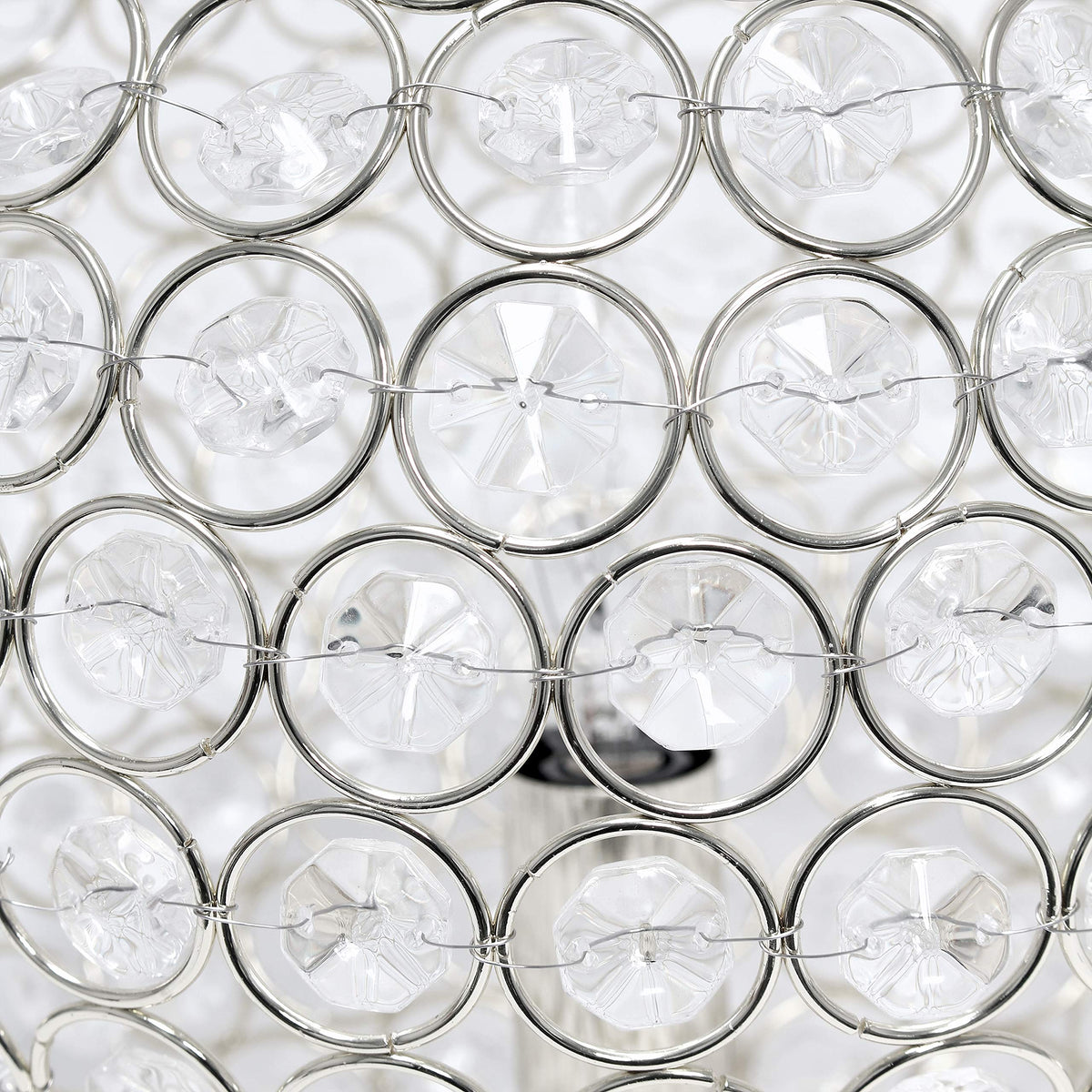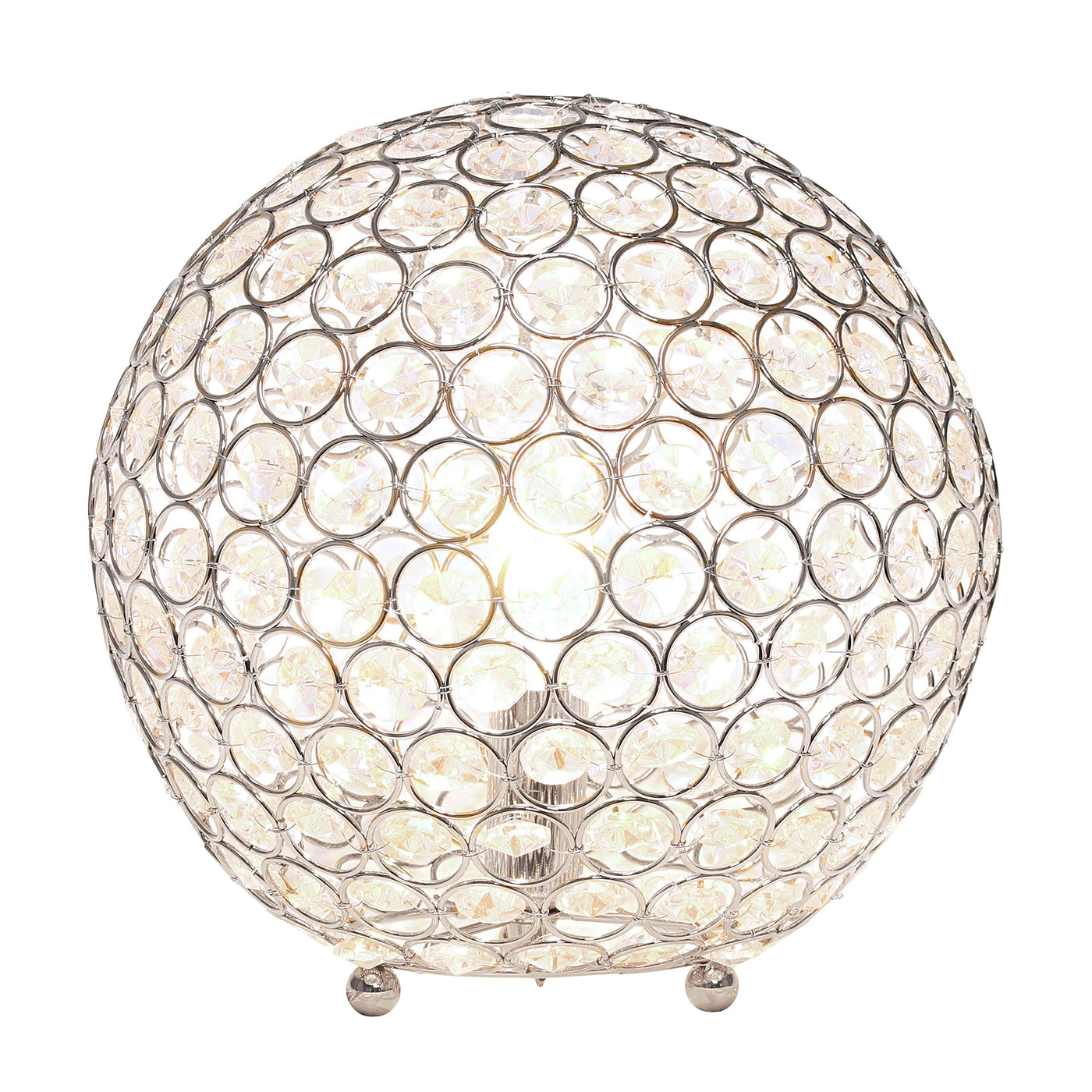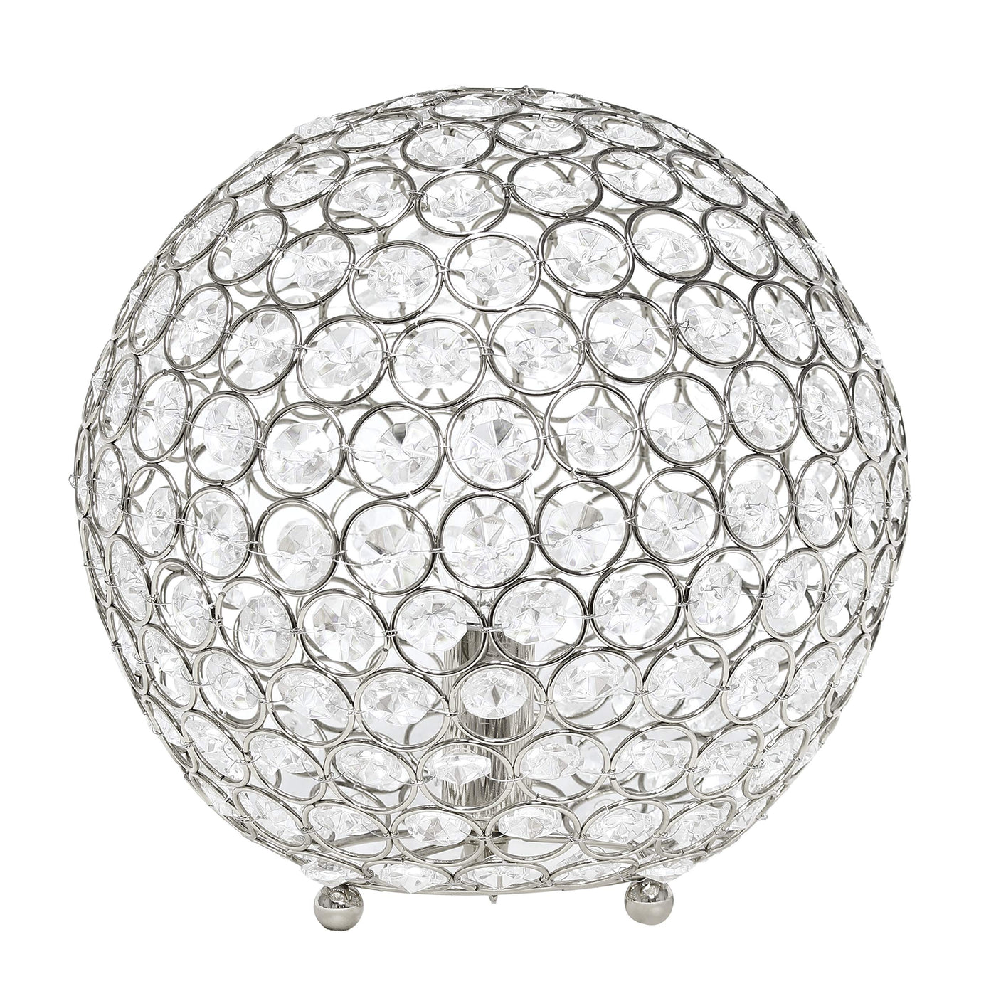 CONTEMPORARY DESIGN: A crystal adorned circular metal frame sits on a three ball base allowing the fixture to stay close to it's supporting furniture and features an open bottom base, perfect for accessing and replacement of the bulb. | ACCESSIBLE SWITCH: An easily accessible gear (rotary) switch is located on the cord of this table lamp to allow a quick and easy on/off function as needed. Lamp is also equipped with a 6 foot plug in cord rooted at the base. | BULB REQUIREMENT SOLD SEPARATELY: This table lamp uses 1 x 40 watt equivalent type B10 candelabra base bulb, which is not included in your purchase but can be easily found online or your local hardware store. | PRODUCT SIZE: Overall product size is L: 10" x W: 10" x H: 10" and weighs 2.95 lbs. | ASSEMBLY & USE: Product ships fully assembled and ready for use. | ADDITIONAL OPTIONS AVAILABLE: Additional color finishes are available. If this finish doesn't perfectly match your space, make sure to check out other options!