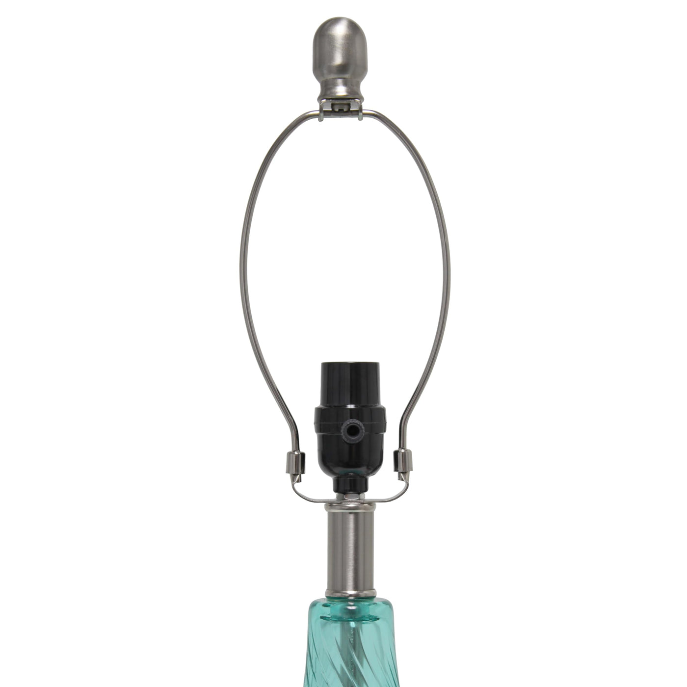 Light blue glass base with draping detail | White fabric tapered shade | 8" Harp & Finial Shade Security with Rotary Switch on Socket | Uses 1 x 150W E26 3-way Medium base bulb (not included) | Shade Dimensions: L:13" x W:14" x H:10" Total Height: 24"