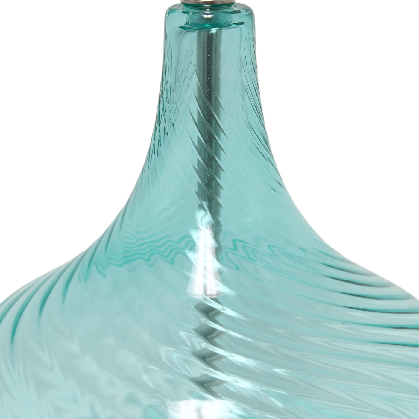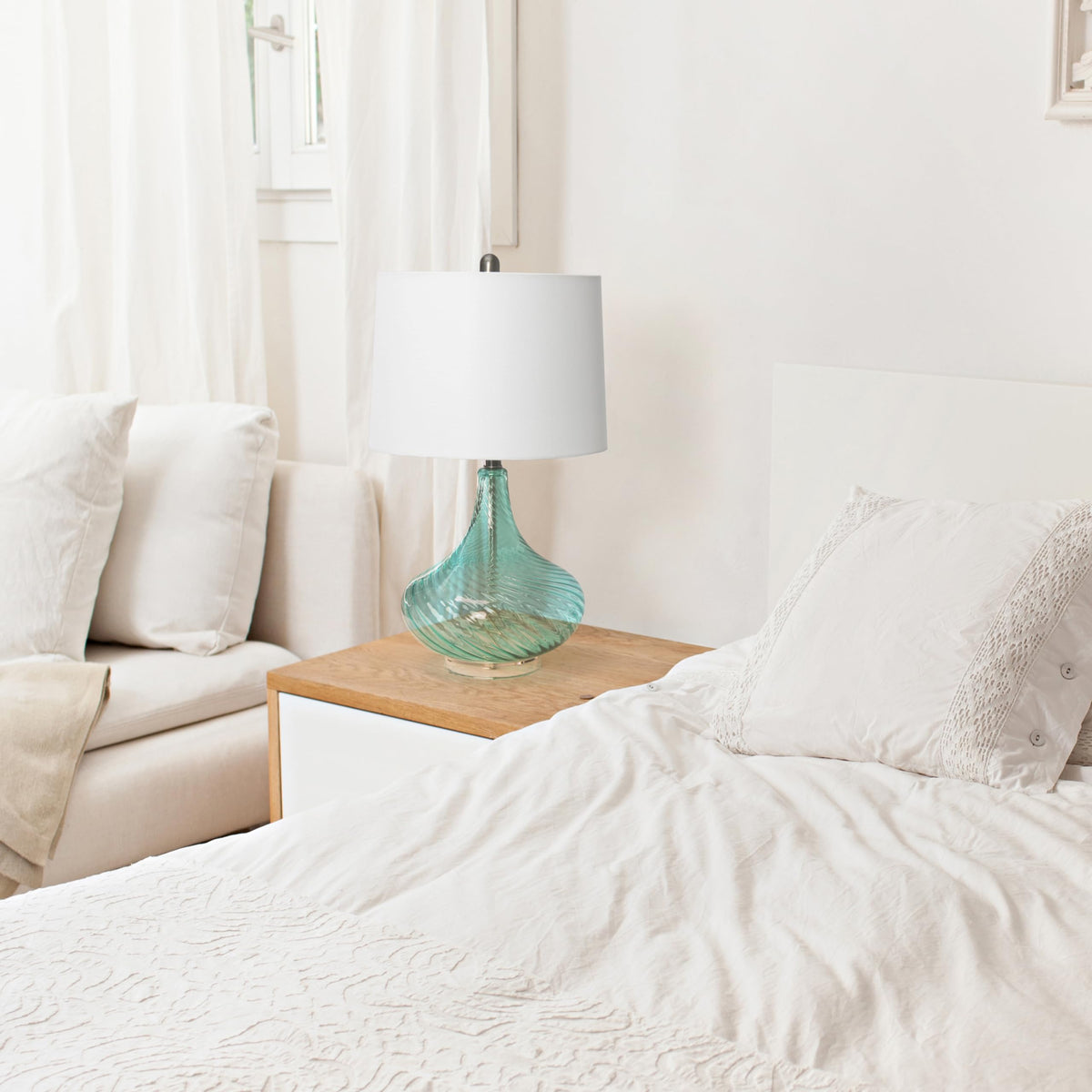 Q: What materials are used in the construction of this lamp?A: This table lamp features a beautiful light blue glass base and a white fabric tapered shade, combining elegance with functionality.