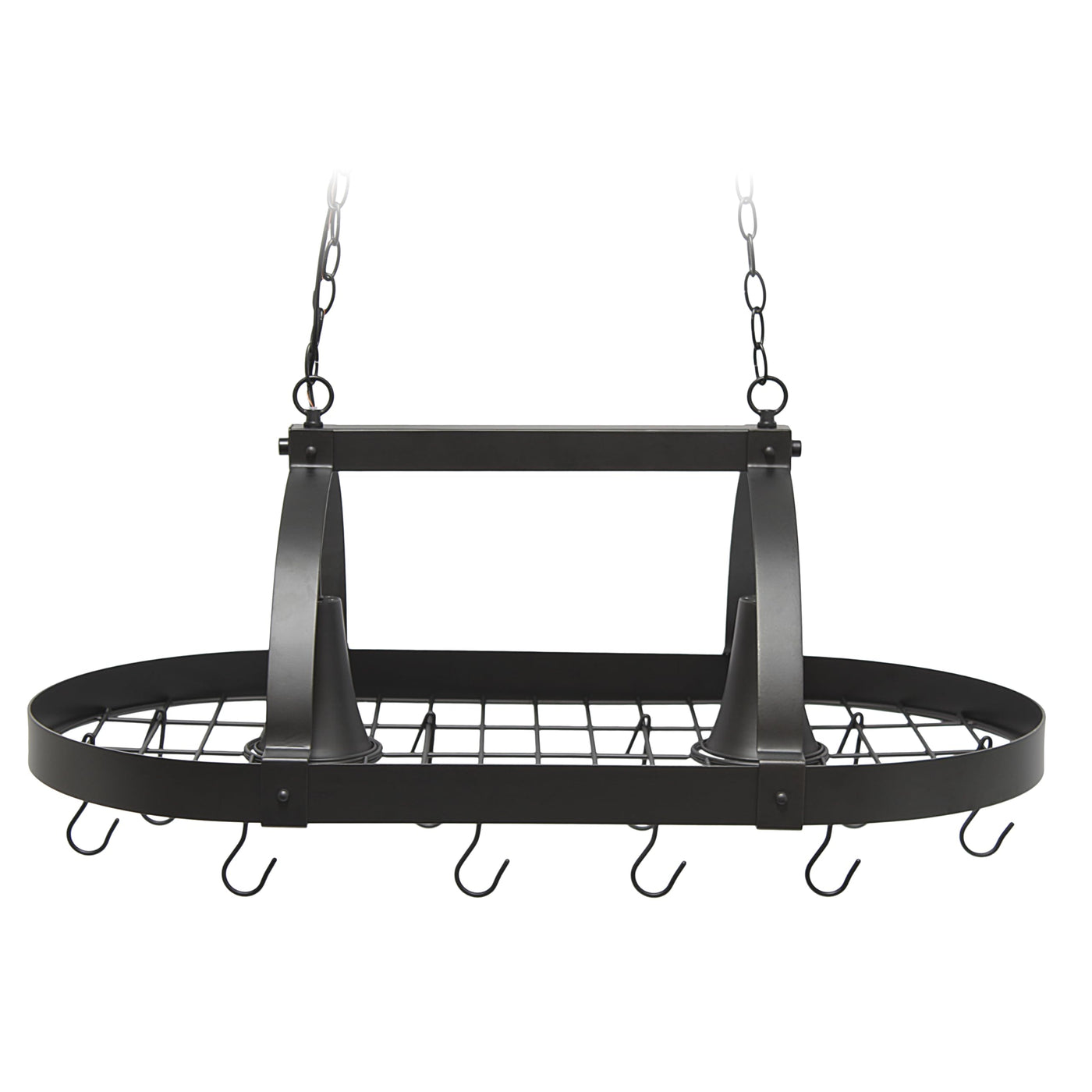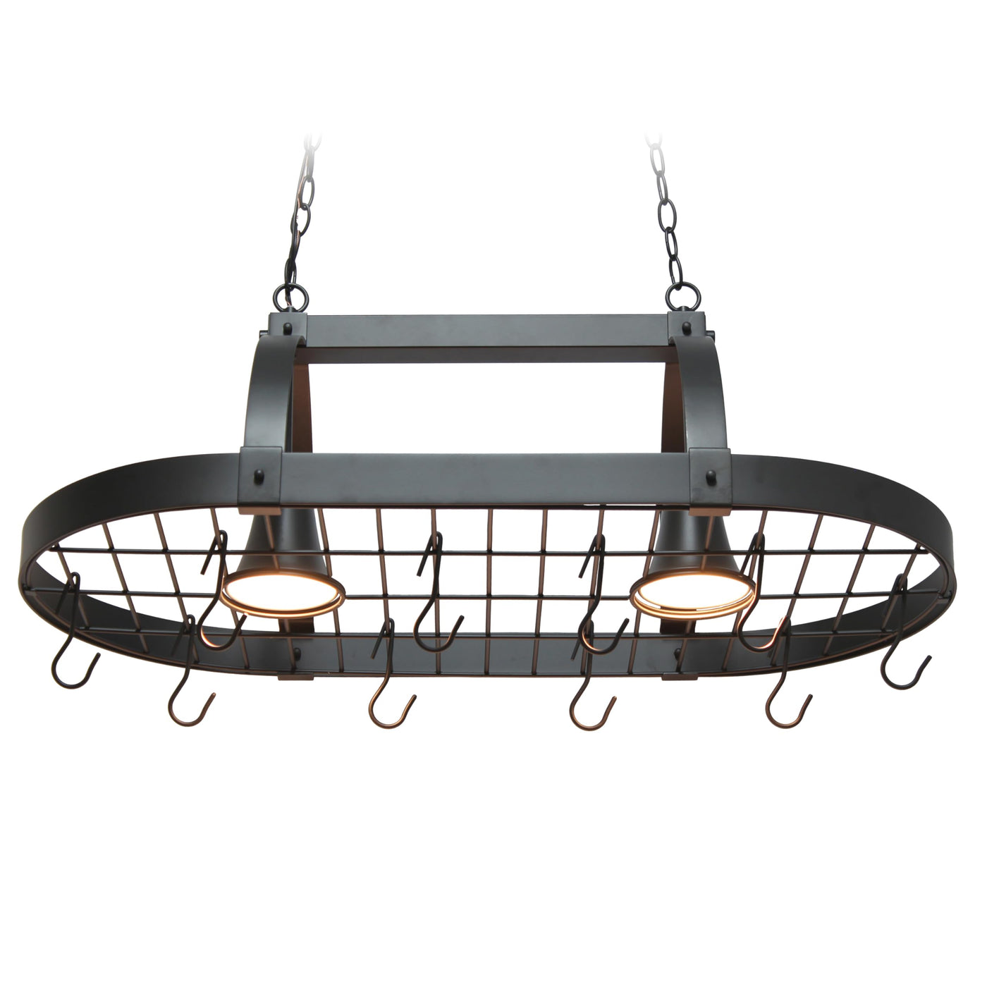 Oil Rubbed Bronze Finish | Requires two 60-Watt Type A standard medium base bulbs (not included) | Product Dimensions: L: 35.50" x W: 19.25" x H: 13.50" | 2 chains. Each chain measures 3 feet. This pot rack was tested to safely hold an additional 20 lbs. of weight. We do not recommend adding more than the specified rated weight. | Includes 10 hooks and installation hardware | Available in additional colors