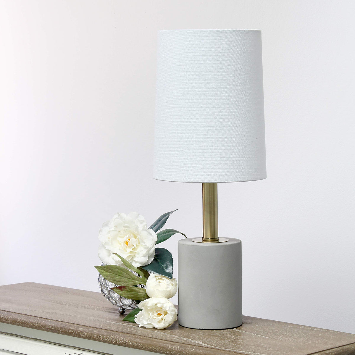 Elegant Designs White Cement Table Lamp With Antique Brass Detail, Fabric Shade