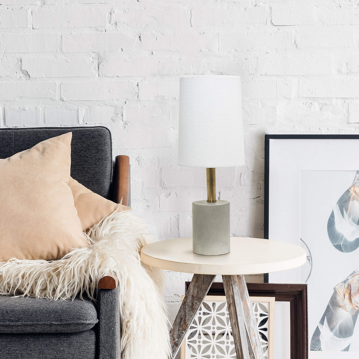 Q: What materials are used in the construction of this lamp?A: The lamp features a gray concrete base paired with a white fabric shade, which adds a modern touch while ensuring durability.