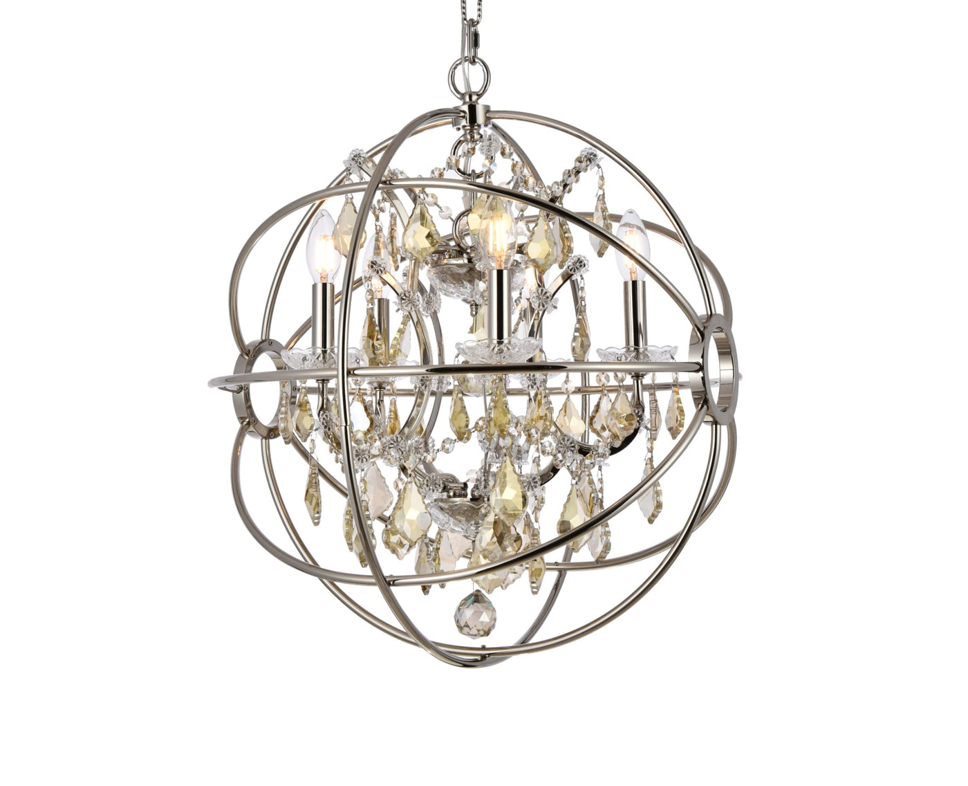 Shades of the past and present merge with new age design to create the geneva The old world feel of a classic crystal chandelier suspended in the modern take on the gyroscope Many finishes and shades of crystal make this a custom classicFeaturesType - Pendant lampStyle - Transitionalcollection - geneva5 Light BulbsBulb Type - E1260 WattsMax Wattage - 300Voltage - 110V-125VFinish - Polished nickelcrystal Trim - Royal cutcrystal color - golden Teak SmokyUL & Ulc StandardSize - 20 W x 23 H inchain/Wire Included - 5 ftǞ ftHanging Weight - 24 lbs
