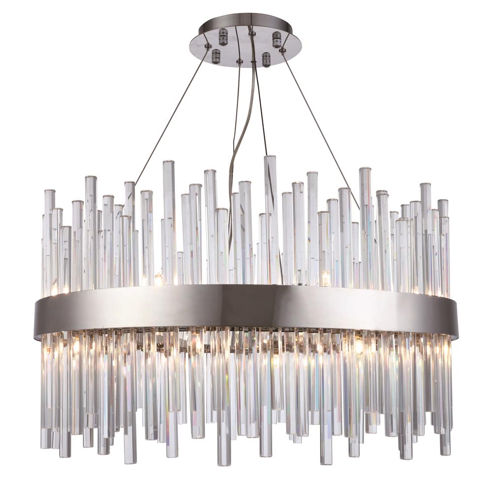 This stately fixture combines timeless elegance with modern sophistication, making it a perfect centerpiece for any contemporary space. The delicate interplay of upright and hanging clear glass rods creates a truly stunning visual statement, seamlessly woven together within a sleek chrome frame. This expressive piece is not just a lighting solution; it is a welcomed addition that enhances a wide range of contemporary residential styles.