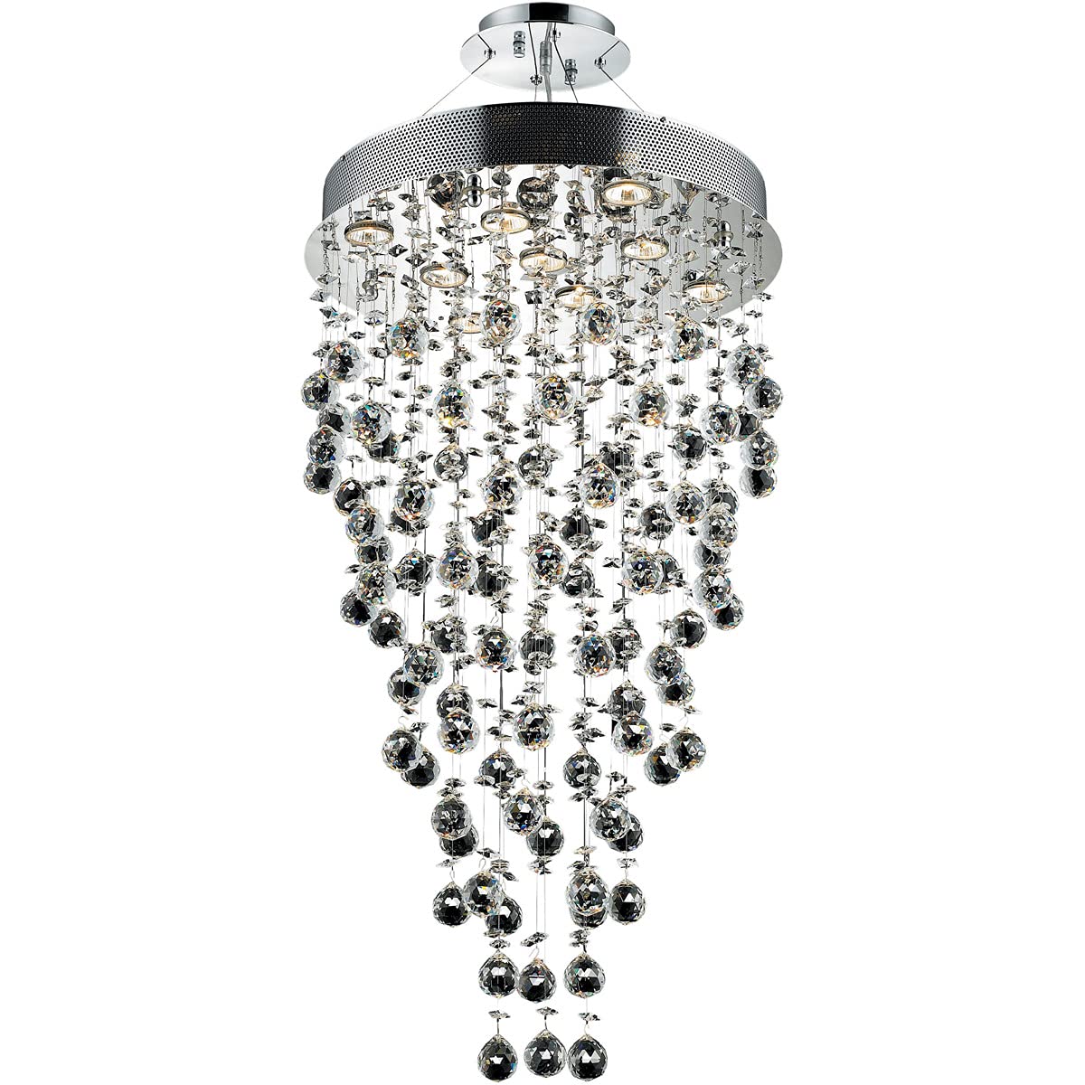Brilliant and intense crystals suspended and slowly spinning in space are the centerpieces of this remarkably distinctive galaxy collection Displaying all the rich and colorful beauty of crystal with virtually invisible and effortless support, this design affords the eye a mesmerizing experienceFeaturesFinish - chromecrystal trim - Royal cutcrystal color - crystal (clear)Style - contemporaryType - Dining roomcollection - galaxyUL & ULc standardchain/Wire included - 6 ftNo of bulb - 9Bulb type - gU10Bulb wattage - 50Max wattage - 450Voltage - 110V-125VHanging weight - 47Dimension - 20 Dia x 36 H in
