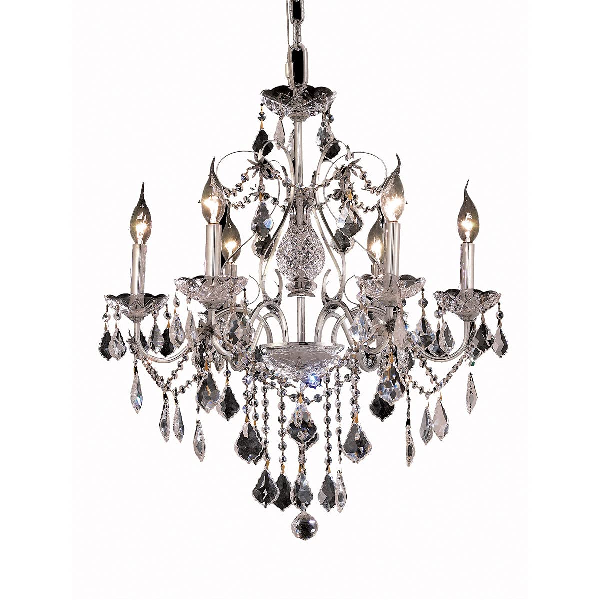 Reminiscent of classic chandeliers, the St Francis series brings the past to life in today's homes with stunning crystal pendalogues and crystal bobeches on gold or chrome framesFeaturesFinish - chromecrystal trim - Royal cutcrystal color - crystal (clear)Style - TransitionalType - Dining roomcollection - St FrancisUL & ULc standardchain/Wire included - 5 ftNo of bulb - 6Bulb type - E12Bulb wattage - 60Max wattage - 360Voltage - 110V-125VHanging weight - 21Dimension - 24 Dia x 21 H in
