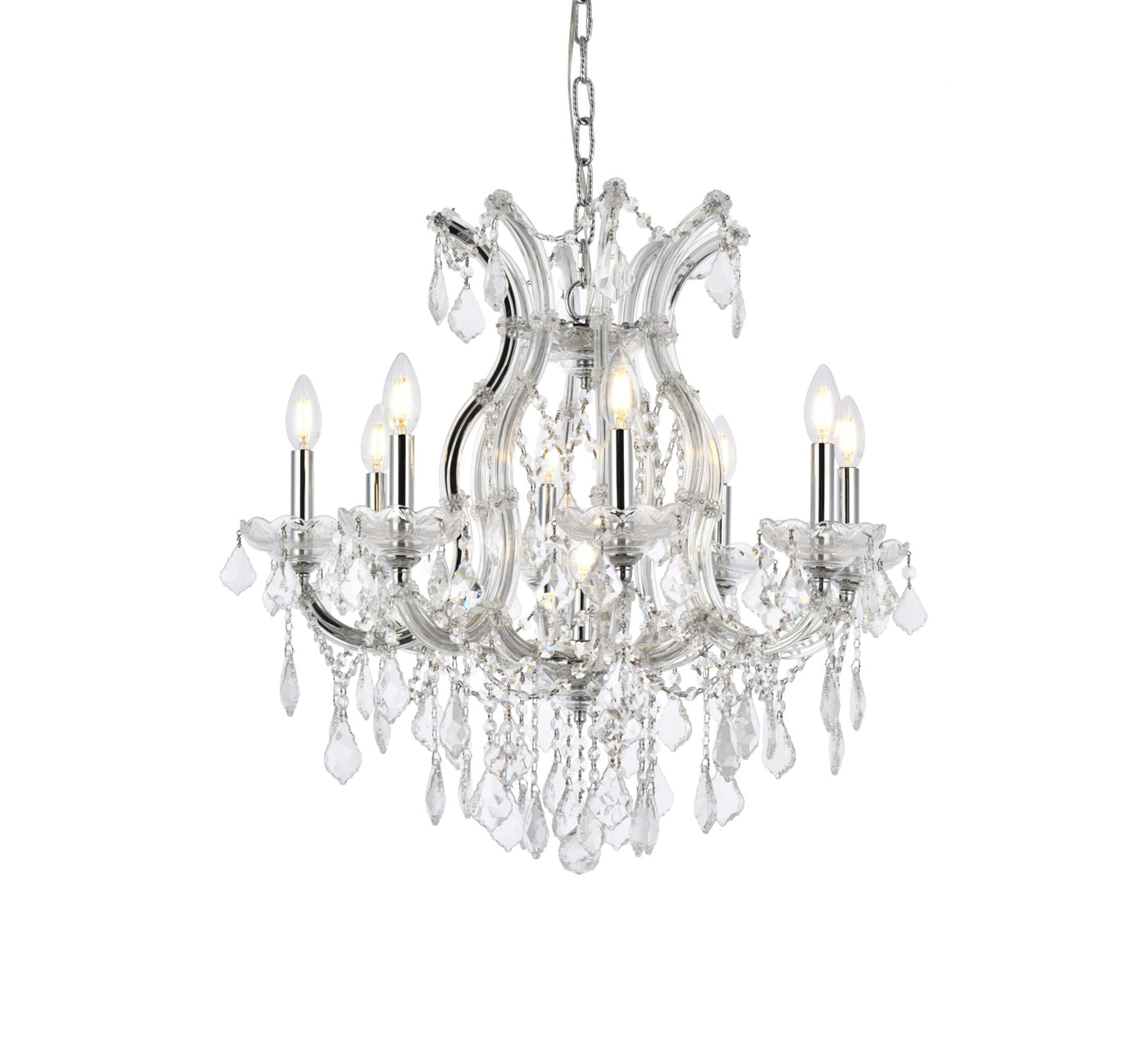 2800 Maria Theresa Collection Hanging Fixture D26in H26in Lt:8+1 Chrome Finish (Royal Cut Golden Teak). Bring the beauty and passion of the Palace of Versailles into your home with this ageless classic. The Maria Theresa has been the gold standard for elegance and grace in the chandelier world for hundreds of years. The Maria Theresa has delicate glass arms draped with plentiful amounts of classic clear crystal or the wildly popular golden teak crystal and is guaranteed to make your home feel like a palace.