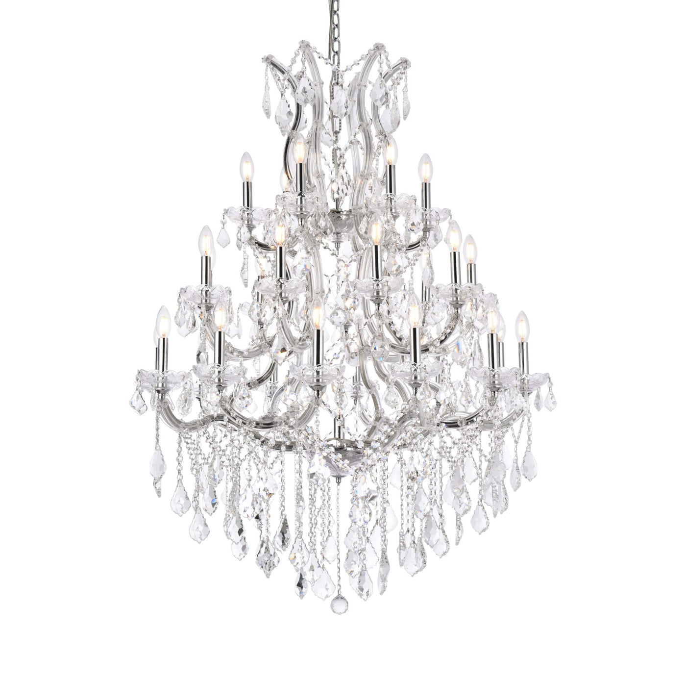 Elegant lighting 2800d38c Maria Theresa 28-light, three-tier crystal chandelier, finished in chrome with clear crystals elegant lighting 2800d38c features: base finish: chrome with clear crystal choose from royal cut, elegant cut, Swarovski Spectra or Swarovski elements crystal types: royal cut- a combination of high quality, lead-free, machine cut and polished crystals, and full-lead machine-cut crystals, whose appearance rivals that of a more expensive chandelier crystal elegant cut- elegant cut crystals consist of 30% high quality full-lead machine-cut crystal that is above industry standards. It possesses sharp faceting polished to a visual radiance Swarovski Spectra- beautiful and reliable quality crystal by Swarovski elements- an exercise in technical perfection, Swarovski elements crystal meets all standards of perfection. It is original, flawless and brilliant, possessing lead oxide in excess of 33%. made in Austria, each facet is perfectly cut and polished by machine to maintain optical purity and consistency (28) 60-watt candelabra base bulbs (not included)hanging WEIGHT 64 included 54 inches of chain/wire for installation three tier chandelier product dimensions: 52 inch h x 38 inch from the elegant lighting Maria Theresa collection elegant lighting, headquartered in Philadelphia, pa, is a premium designer of crystal lighting. Since its inception in the year 2000, elegant lighting has made innovative strides in crystal lighting design, that resulted in them becoming the fastest-growing crystal lighting Company in the industry. Elegant lighting actively ensures, throughout every step of production, that the lighting you purchase is a beautiful piece of art, and that it graces your home or business with its sheer perfection.
