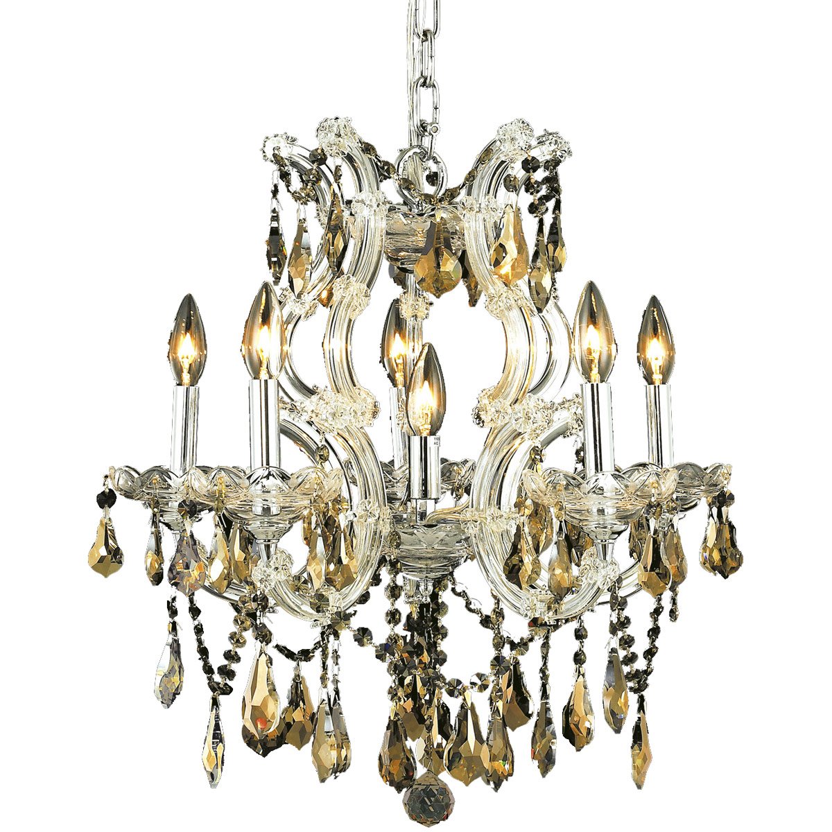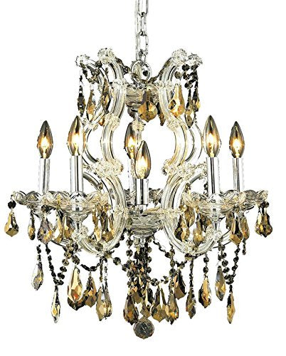 Elegant lighting 2801d20c-gt Maria Theresa 6-light, single-tier crystal chandelier, finished in chrome with smoky Golden Teak crystals elegant lighting 2801d20c-gt features: base finish: chrome with smoky Golden Teak crystal choose from royal cut or Swarovski elements crystal types: royal cut- a combination of high quality, lead-free, machine cut and polished crystals, and full-lead machine-cut crystals, whose appearance rivals that of a more expensive chandelier crystal Swarovski elements- an exercise in technical perfection, Swarovski elements crystal meets all standards of perfection. It is original, flawless and brilliant, possessing lead oxide in excess of 33%. made in Austria, each facet is perfectly cut and polished by machine to maintain optical purity and consistency (6) 60-watt candelabra base bulbs (not included)hanging WEIGHT 20 included 54 inches of chain/wire for installation single tier chandelier product dimensions: 25 inch h x 20 inch from the elegant lighting Maria Theresa collection elegant lighting, headquartered in Philadelphia, pa, is a premium designer of crystal lighting. Since its inception in the year 2000, elegant lighting has made innovative strides in crystal lighting design, that resulted in them becoming the fastest-growing crystal lighting Company in the industry. Elegant lighting actively ensures, throughout every step of production, that the lighting you purchase is a beautiful piece of art, and that it graces your home or business with its sheer perfection.