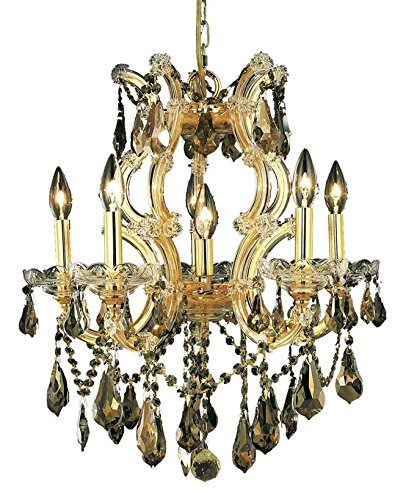 Elegant lighting 2801d20g-gt Maria Theresa 6-light, single-tier crystal chandelier, finished in gold with smoky Golden Teak crystals elegant lighting 2801d20g-gt features: base finish: gold with smoky Golden Teak crystal choose from royal cut or Swarovski elements crystal types: royal cut- a combination of high quality, lead-free, machine cut and polished crystals, and full-lead machine-cut crystals, whose appearance rivals that of a more expensive chandelier crystal Swarovski elements- an exercise in technical perfection, Swarovski elements crystal meets all standards of perfection. It is original, flawless and brilliant, possessing lead oxide in excess of 33%. made in Austria, each facet is perfectly cut and polished by machine to maintain optical purity and consistency (6) 60-watt candelabra base bulbs (not included)hanging WEIGHT 20 included 54 inches of chain/wire for installation single tier chandelier product dimensions: 25 inch h x 20 inch from the elegant lighting Maria Theresa collection elegant lighting, headquartered in Philadelphia, pa, is a premium designer of crystal lighting. Since its inception in the year 2000, elegant lighting has made innovative strides in crystal lighting design, that resulted in them becoming the fastest-growing crystal lighting Company in the industry. Elegant lighting actively ensures, throughout every step of production, that the lighting you purchase is a beautiful piece of art, and that it graces your home or business with its sheer perfection.