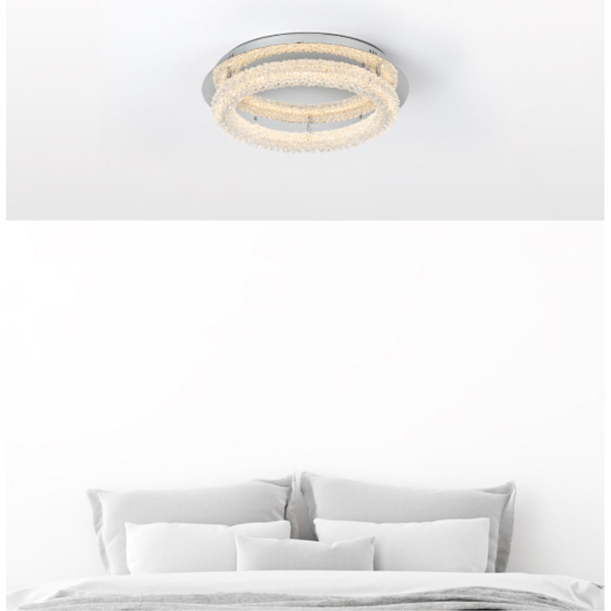 Q: What materials are used in the construction of this flush mount?A: This flush mount is crafted from durable iron metal and adorned with clear crystal, providing both strength and an elegant aesthetic.