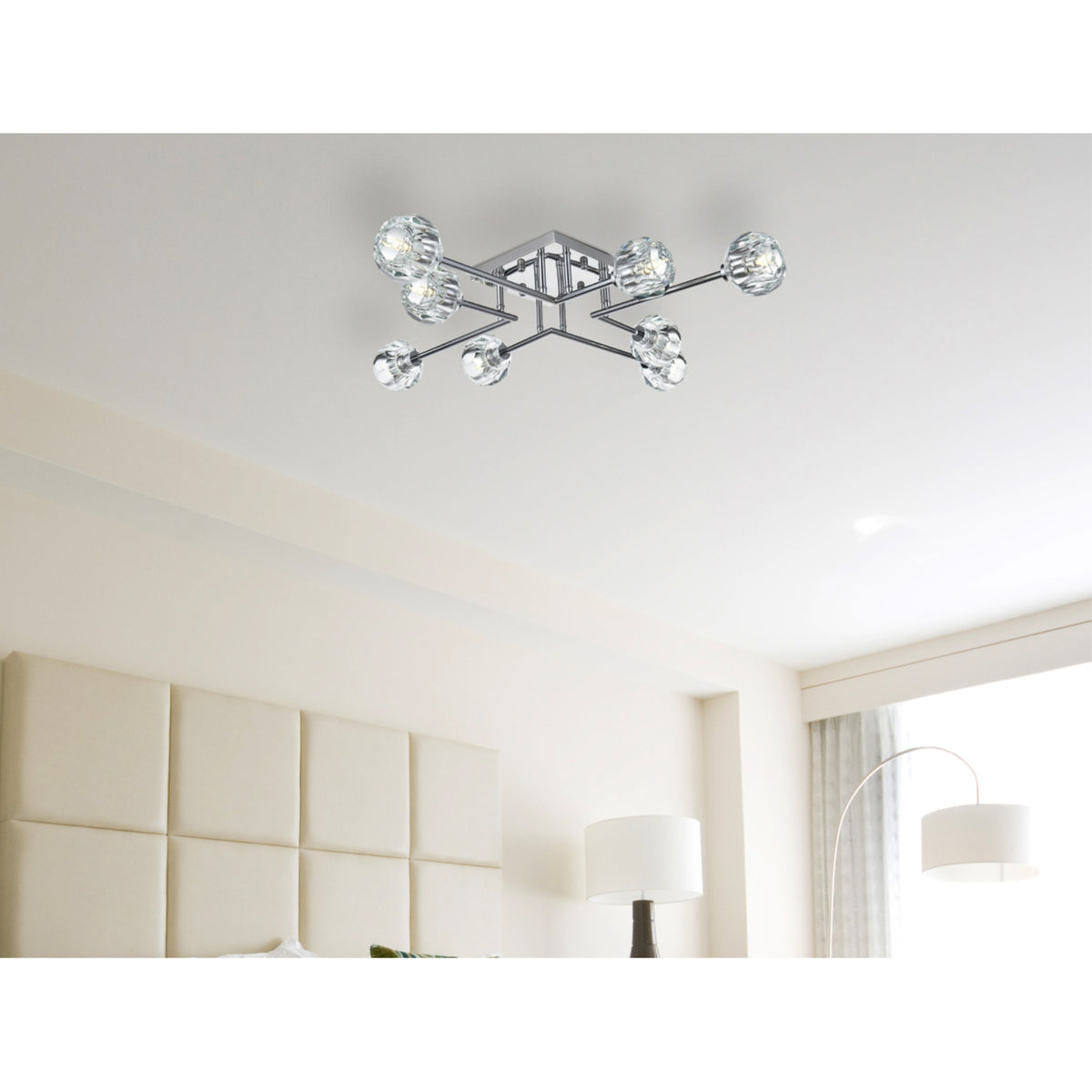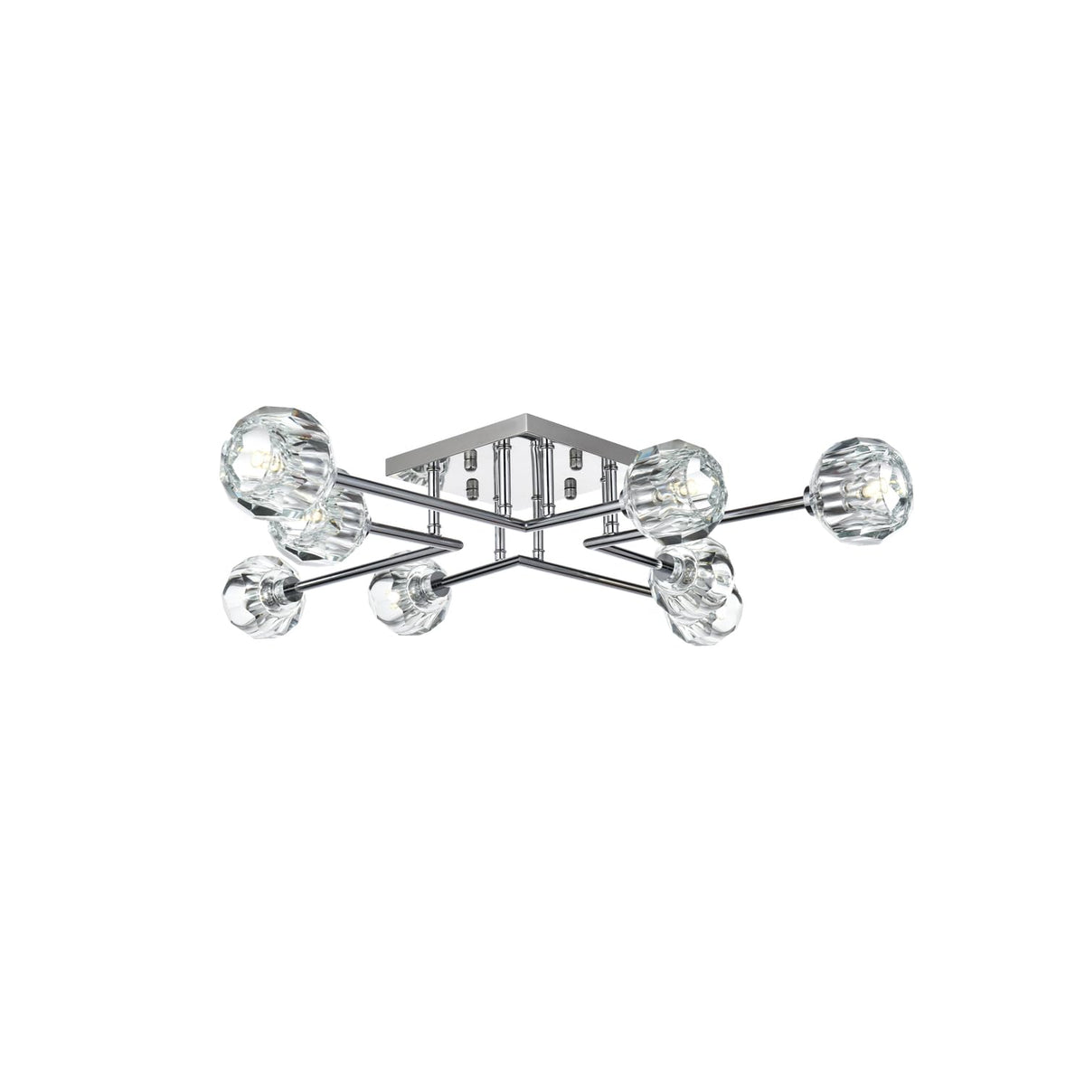 Introducing the Eren 31-inch flush mount— Introducing our 31-inch flush mount—a captivating addition that effortlessly enhances your space with a touch of contemporary sophistication, making a statement with its presence. Eight lights adorned with faceted crystal glass shades cast a luxurious and dazzling radiance, creating an atmosphere of timeless elegance. Crafted with durability in mind, the robust iron base complements the flush mount's contemporary design with a touch of industrial elegance. With a flush design, this fixture hugs the ceiling, delivering both space-saving practicality and elegant style. Redefine your space with the perfect blend of style, durability, and radiant illumination.