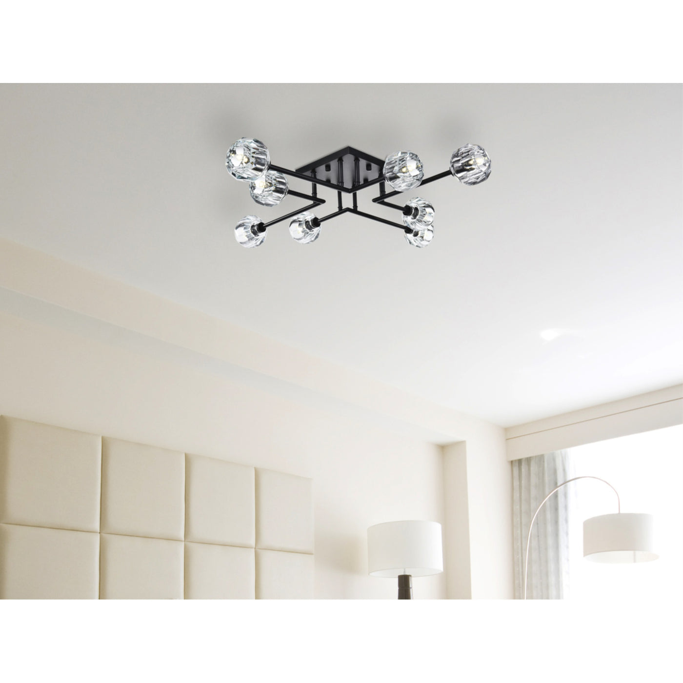 This flush mount light features a robust construction with a durable iron base, ensuring longevity and stability. The striking black finish adds a contemporary touch, while the eight lights, adorned with faceted crystal glass shades, create a elegant ambiance. The fixture’s 31-inch diameter provides substantial lighting coverage, making it ideal for larger areas such as living rooms, dining rooms, or entryways.