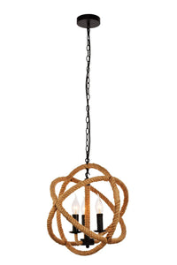 Minimal, but with a sense of postmodern humor, Gerrit collection hanging fixtures will be a charming novelty in a kitchen, entryway, office, or above a bar. An unconventional gyroscope-style frame features three connected rings wrapped in coarse rope that lend the design both personality and texture. Three candle-like exposed bulbs gleam at the center, adding a dash of vintage charm. This fixture can accommodate either incandescent or LED bulbs (not included). The brown and black finish of the cord, socket, and mounting fixture contrast the rope trim nicely.