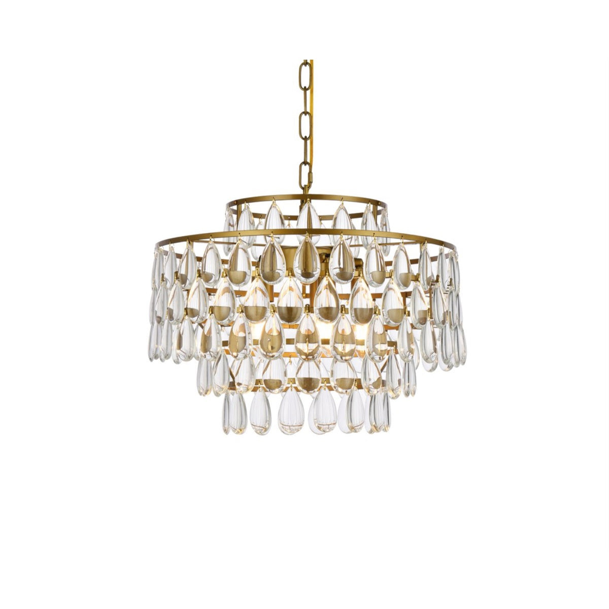 Install this pendant in any room to give an elegant look. This stunning light features hand painted finish and clear brillant crystals which gives a classy look. Set a cozy atmosphere when you switch on this dazzling fixture and captivate your guests. hand painted finish in brass. minimum hanging height of 15 inches and maximum hanging height of 72 inches. suspended from a hanging chain that is 59 inch long. requires 5 E12 bulbs (bulbs are not provided). tiers of clear smooth almond shaped crystals reflect the soft glow of candelabra bulbs. minor crystal assembly required. lighting is dimmable