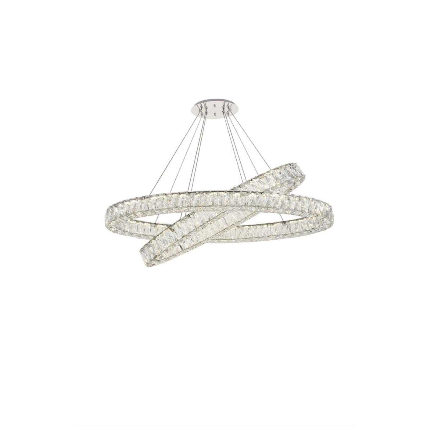 Diamonds are a girl's best friend, and sparkling Monroe collection hanging fixtures take Marilyn's famous lines to heart for women and men alike. A minimal stainless-steel frame in a smooth chrome finish becomes dazzling when it is covered entirely with rectangular and square spectacularly faceted royal-cut clear crystals. The oblong design hangs from almost invisible wires with brilliant integrated LED shining unseen from within. Stunning when placed in a dining room, kitchen, living room, or bedroom.Two tiers of minimal stainless-steel rings in a smooth chrome finish become dazzling when they are covered with rectangular and square spectacularly faceted royal-cut clear crystals. Illuminated with integrated led chips. color temperature: 4000K. Lumens: 8000. adjustable hanging wire. energy saving. feature clear crystals
