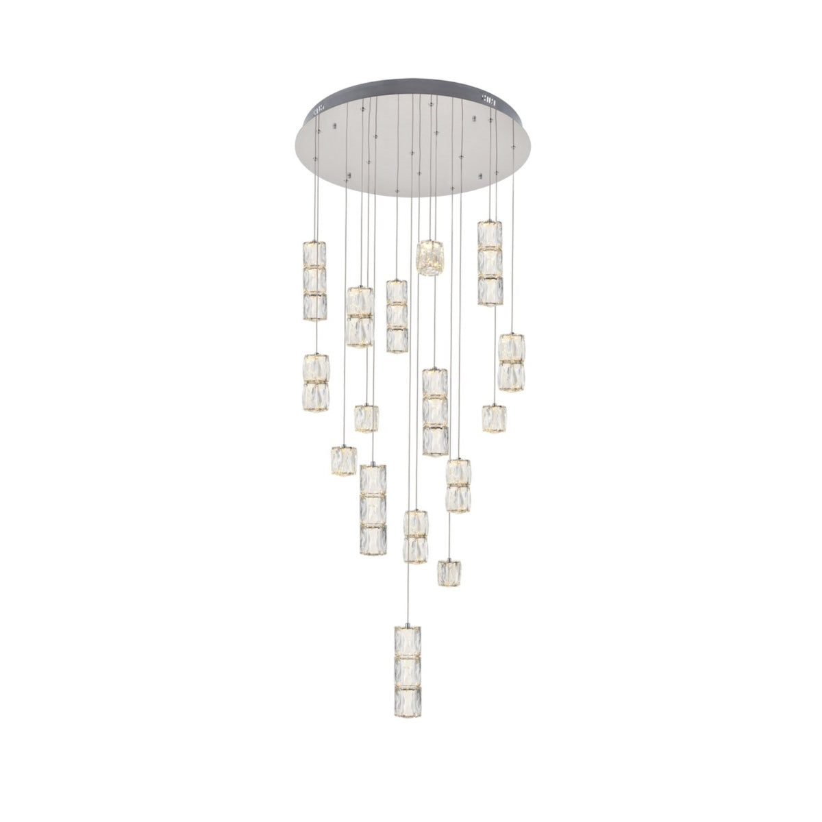 The Polaris collection is the epitome of "cool" in lighting, because each of the fixtures has rectangular, elegant-cut crystals that look like ice cubes, gracefully suspended from a stainless-steel base with a bright chrome finish. Designed for rooms with higher ceilings, these fixtures are definitely stylistic attention-getters.Multi-sided, clear crystals provide unique appearance and distinctive lighting. Illumination comes from a dimmable, integrated LED bulb. color temperature: 3000K. Lumens: 8500. adjustable hanging wire. energy saving. feature clear crystals
