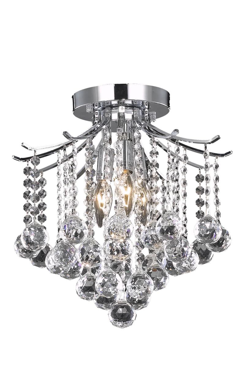 The Amelia collection sparkles with an extraordinary display of faceted Crystal balls dangling from strands of octagon Crystals, creating the illusion of a shimmering cascade of ornamentation pouring from a sleek metal canopy. These fixtures would be a commanding visual presence in any room, and will fit comfortably in smaller spaces.The fixture features a bright chrome base with an array of squared metal arms. Illumination comes from 3 candelabra bulbs (not included) . The fixture is 12 inches in diameter and 12 inches in height.