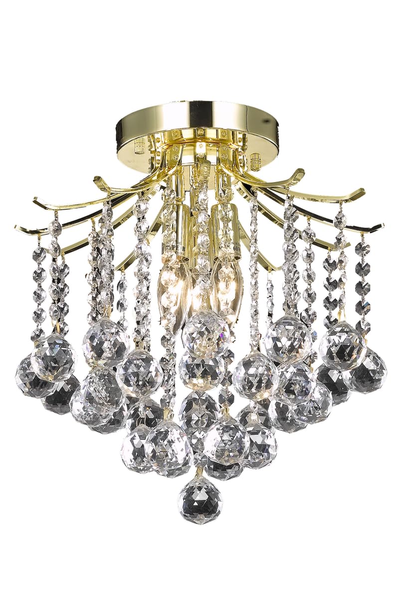 The Amelia collection sparkles with an extraordinary display of faceted Crystal balls dangling from strands of octagon Crystals, creating the illusion of a shimmering cascade of ornamentation pouring from a sleek metal canopy. These fixtures would be a commanding visual presence in any room, and will fit comfortably in smaller spaces.The fixture features a bright gold base with an array of squared metal arms. Illumination comes from 3 candelabra bulbs (not included) . The fixture is 12 inches in diameter and 12 inches in height.