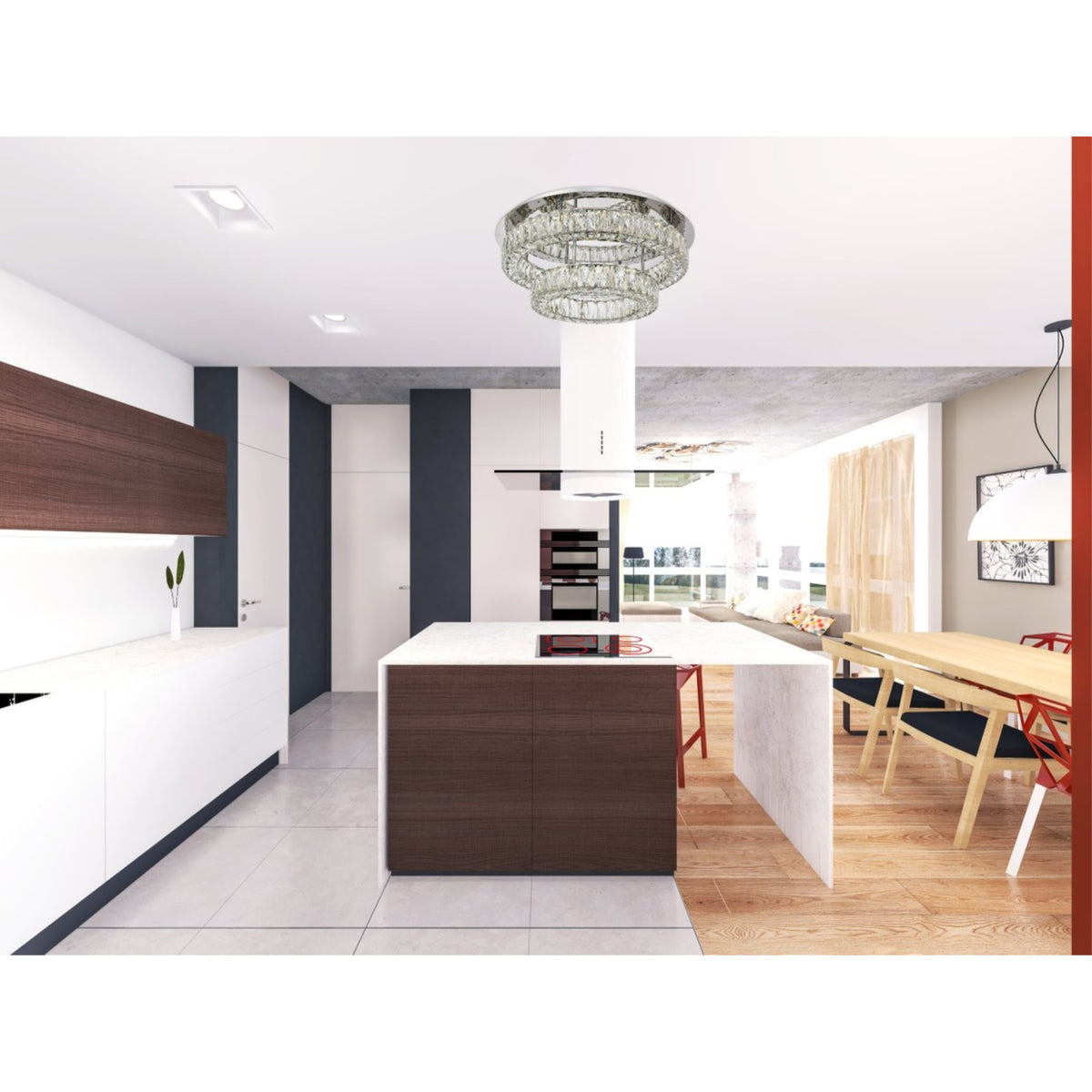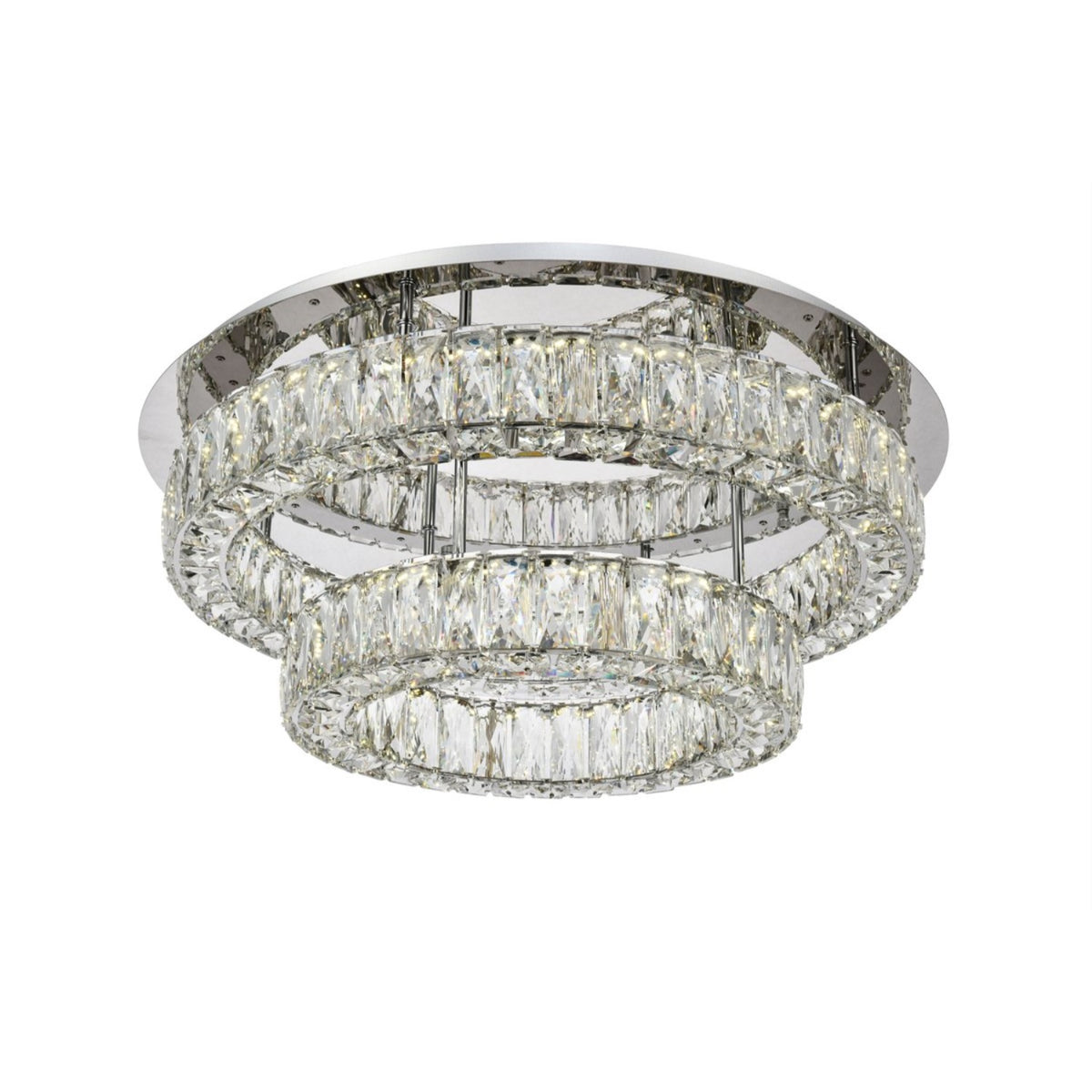 The Monroe collection features two tiers of minimal stainless-steel rings finished in a sleek chrome. These rings are adorned with rectangular and square royal-cut clear crystals, creating a stunning visual effect when illuminated. The integrated LED chips provide brilliant, energy-efficient lighting, while the polished mounting fixture enhances the luminescence, ensuring your space is beautifully lit.