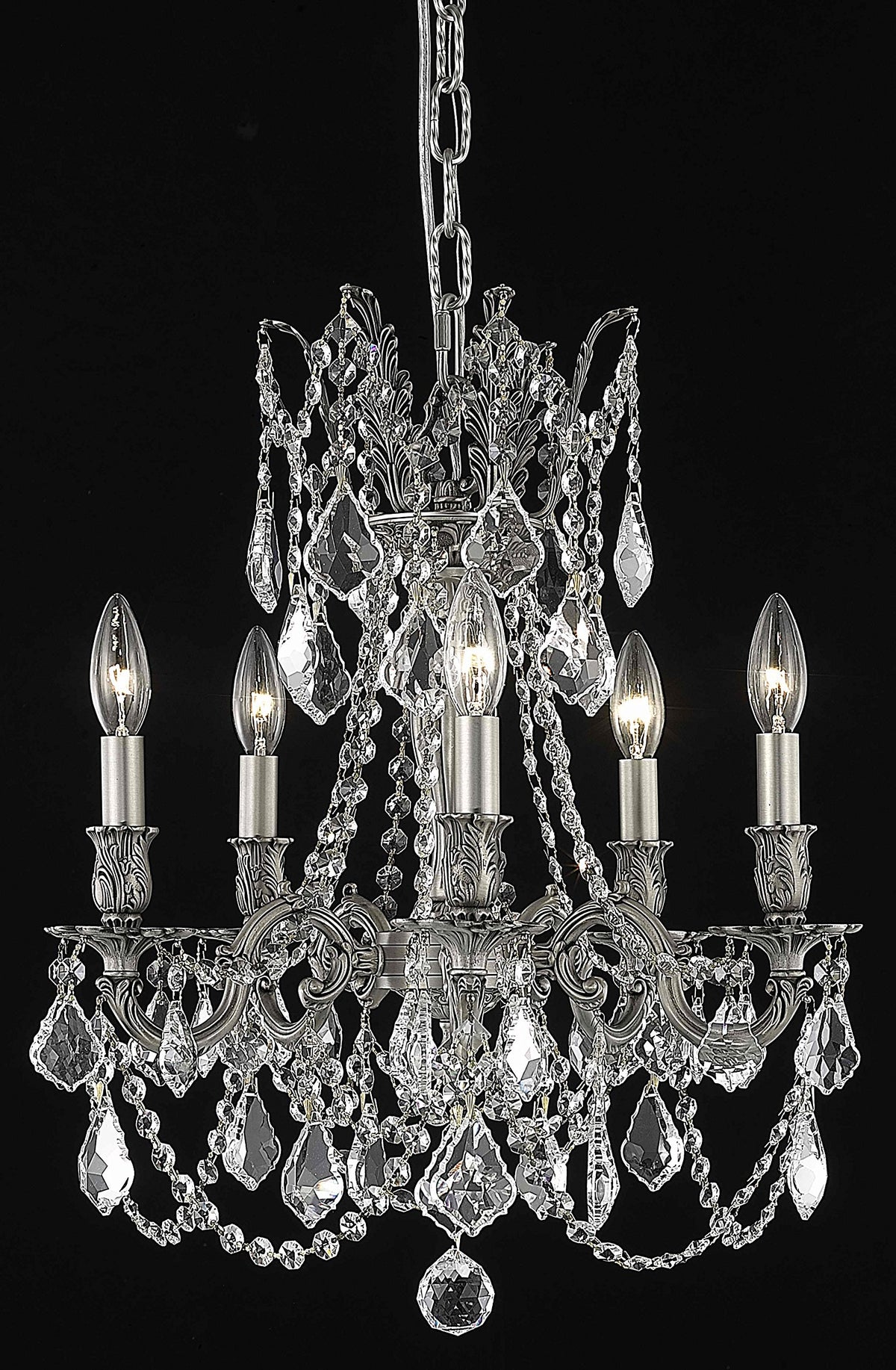 Q: What are the dimensions of the Rosalie 5-light chandelier?A: The chandelier has a height of 19 inches and a width of 18 inches, making it a perfect size for various room settings.